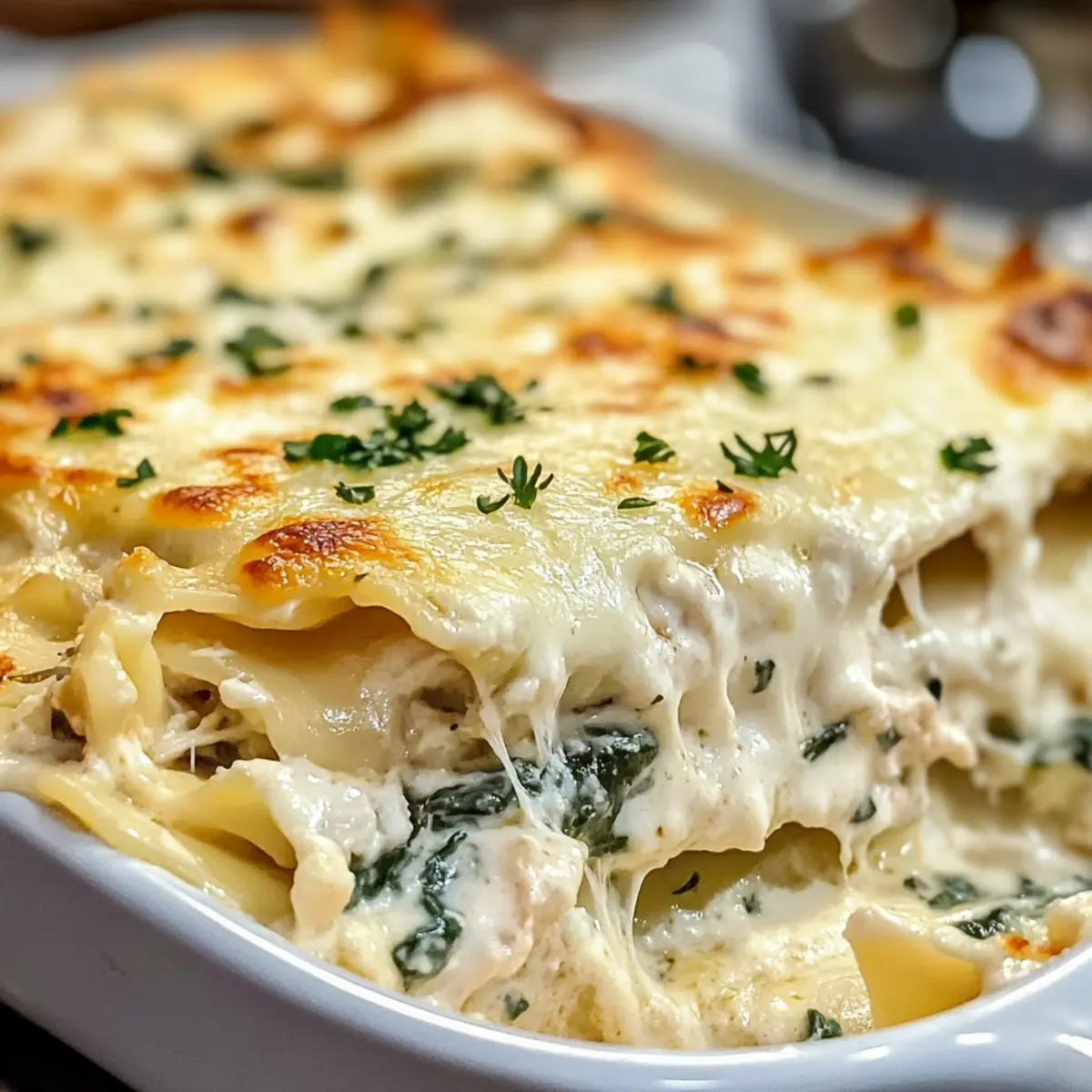 „Wenn der Duft von geschmolzenem Käse und frisch zubereitetem Alfredo-Sauce durch die Küche zieht, kann ich nicht widerstehen. Ich erinnere mich an die Momente, in denen meine Familie um den Tisch versammelt war, und wir uns der cremigen Alfredo-Hühn-Lasagne widmeten – ein echter Publikumsliebling! Diese schmackhafte Variante des klassischen italienischen Gerichts bringt eine elegante weiße Sauce sowie zarte Babyspinatblätter ins Spiel, und das Beste daran? Sie ist nicht nur ein wahrer Genuss für die Sinne, sondern lässt sich auch mühelos vorbereiten. Egal, ob für ein Familienessen oder einen gemütlichen Abend mit Freunden, diese Lasagne ist der Inbegriff von Hausmannskost! Welche Zutaten werden dich dazu inspirieren, gleich loszulegen?“