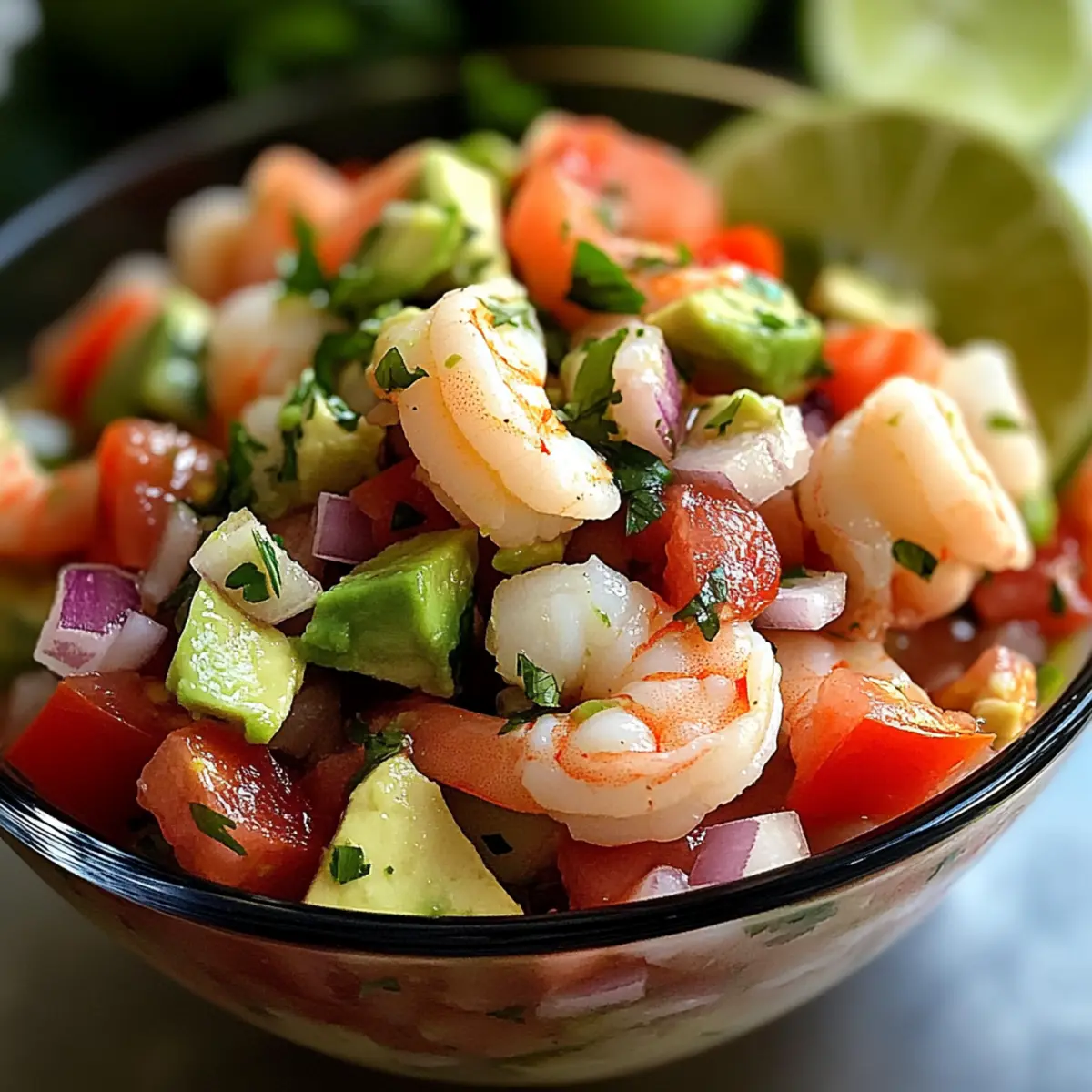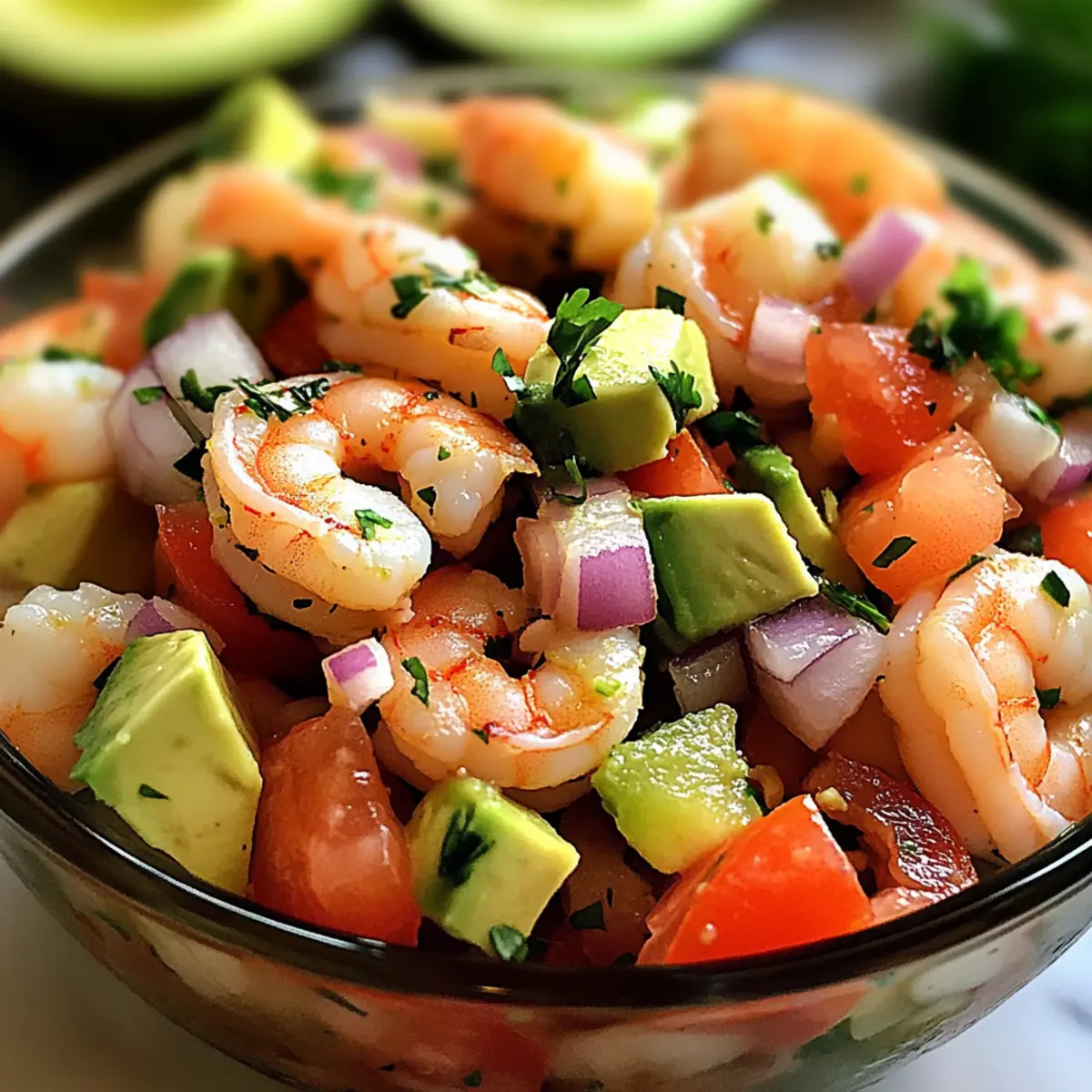 Avocado Garnelen Ceviche ist ideal für die Vorausplanung deiner Mahlzeiten! Du kannst die Garnelen bis zu 24 Stunden im Voraus marinieren, indem du sie mit Limettensaft einlegst und dann im Kühlschrank aufbewahrst, um ihre Frische zu bewahren. Die Gemüsebestandteile wie Tomaten, Zwiebeln und Koriander können ebenfalls bereits 3 Tage vor dem Servieren vorbereitet und in einem luftdichten Behälter im Kühlschrank gelagert werden. Um die Qualität zu erhalten, füge die Avocado erst kurz vor dem Servieren hinzu, da sie sonst braun werden könnte. Wenn du bereit bist zu genießen, mischst du einfach alles zusammen und servierst es mit Crackern oder Tortilla-Chips – so zauberst du ein köstliches und zeitsparendes Sommergericht ganz leicht!