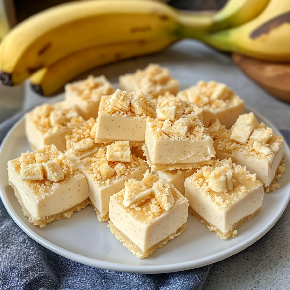 Streue die zerbröselten Nilla Waffeln gleichmäßig auf die Oberfläche des Fudge und drücke sie sanft hinein, damit sie haften bleiben. Die Waffeln geben dem Fudge zusätzlichen Crunch und verstärken den klassischen Bananenpudding-Geschmack.