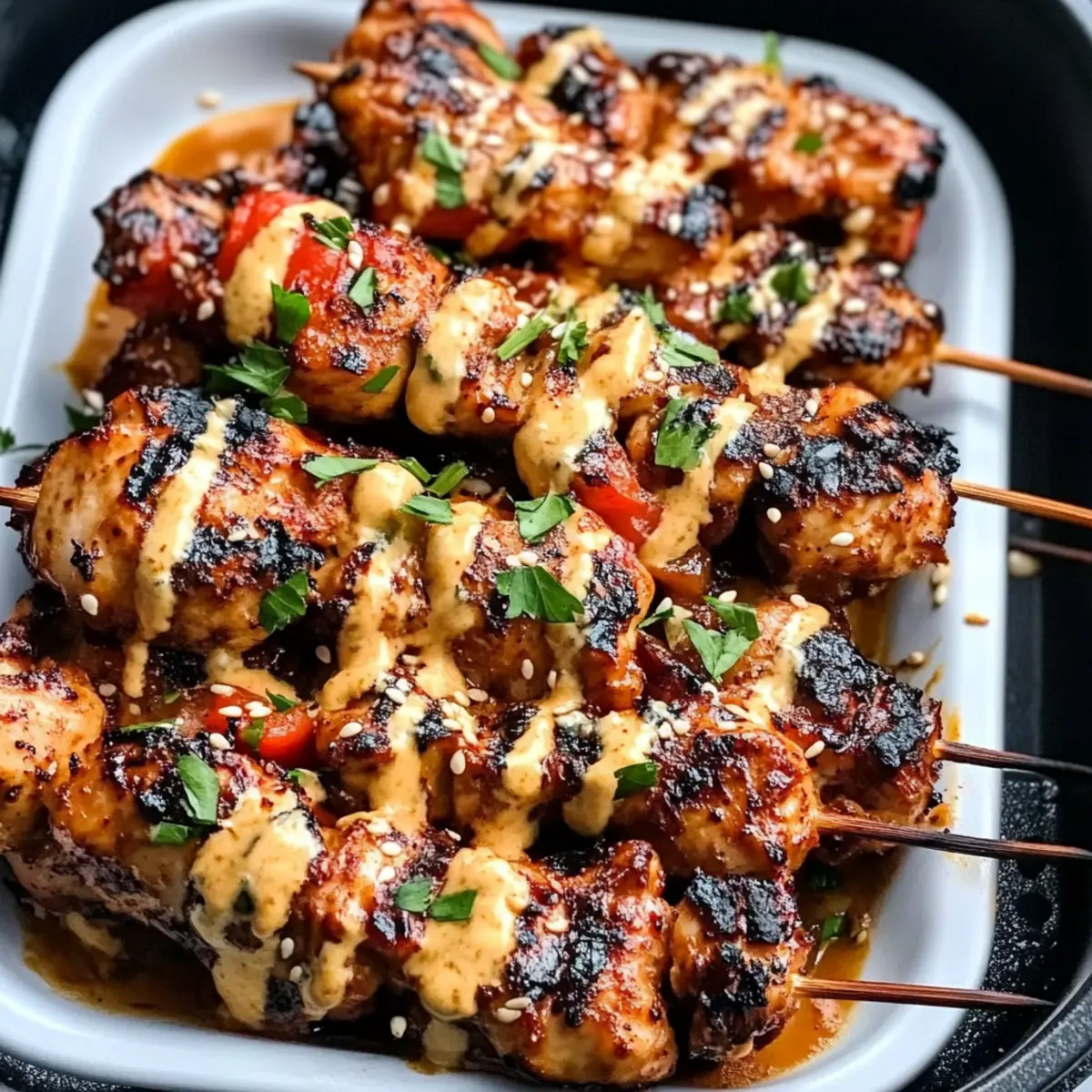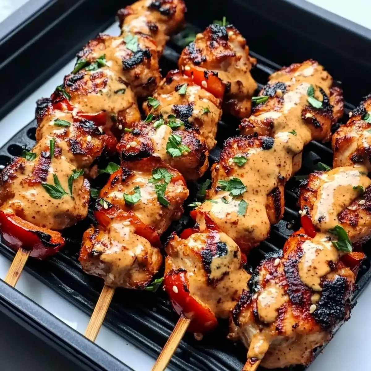 - Nimm die Hähnchenspieße aus dem Air Fryer, wenn sie gar sind und garniere sie mit frischer Petersilie oder Sesam.