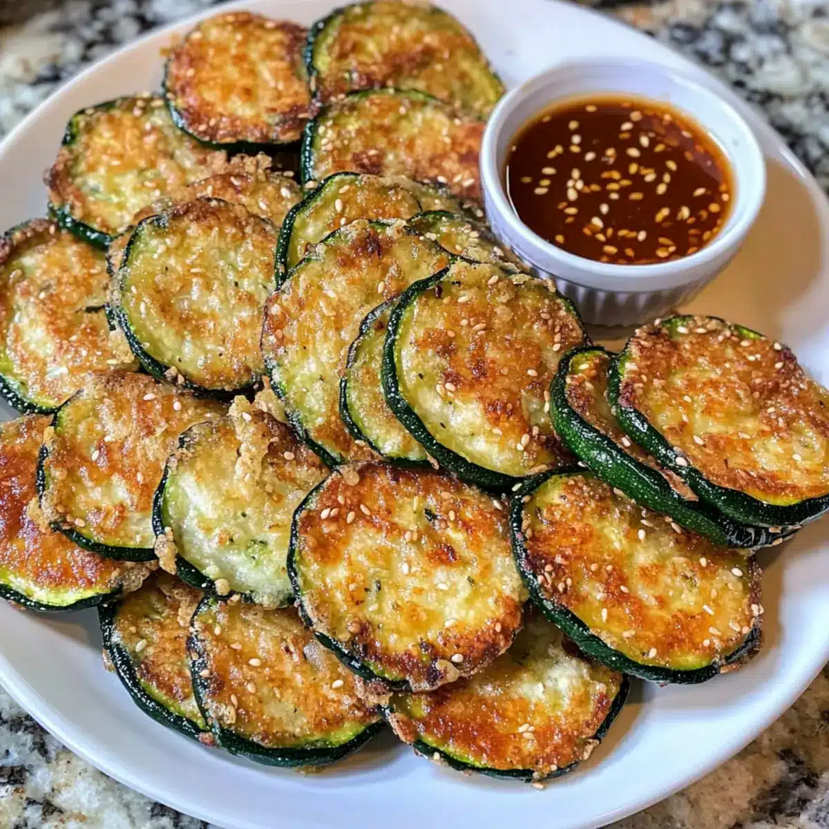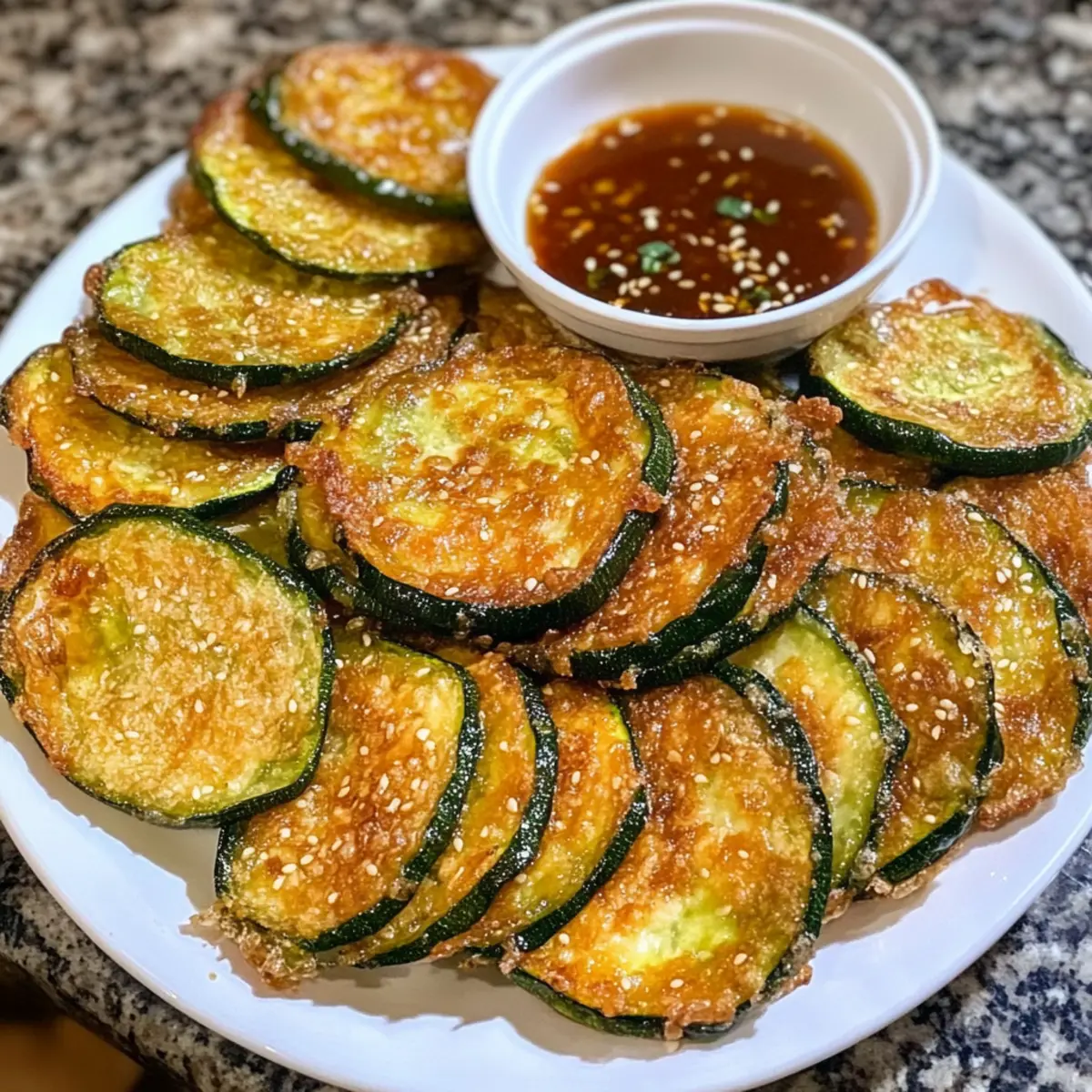 - Serviere die frisch gebratenen Zucchini heiß mit der Dip-Sauce. Optional mit gerösteten Sesamsamen bestreuen.
