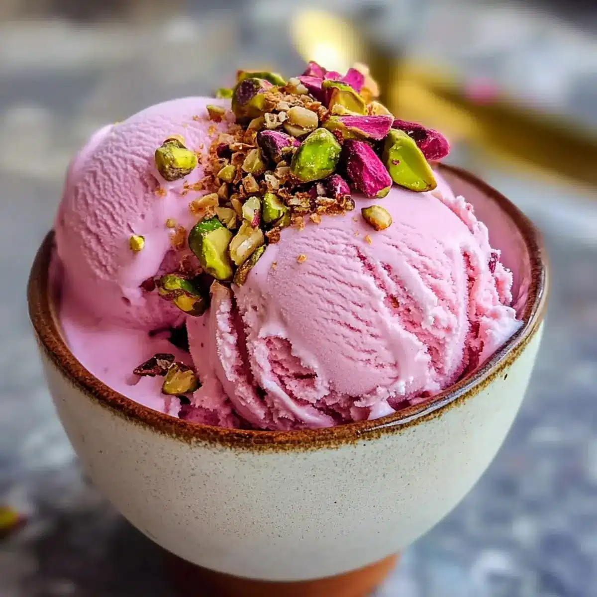 Rosen-Eiscreme mit Pistazien und kandierten Nüssen