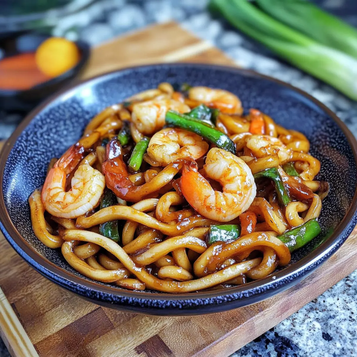 Schnelle Yaki Udon mit Garnelen für jeden Abend