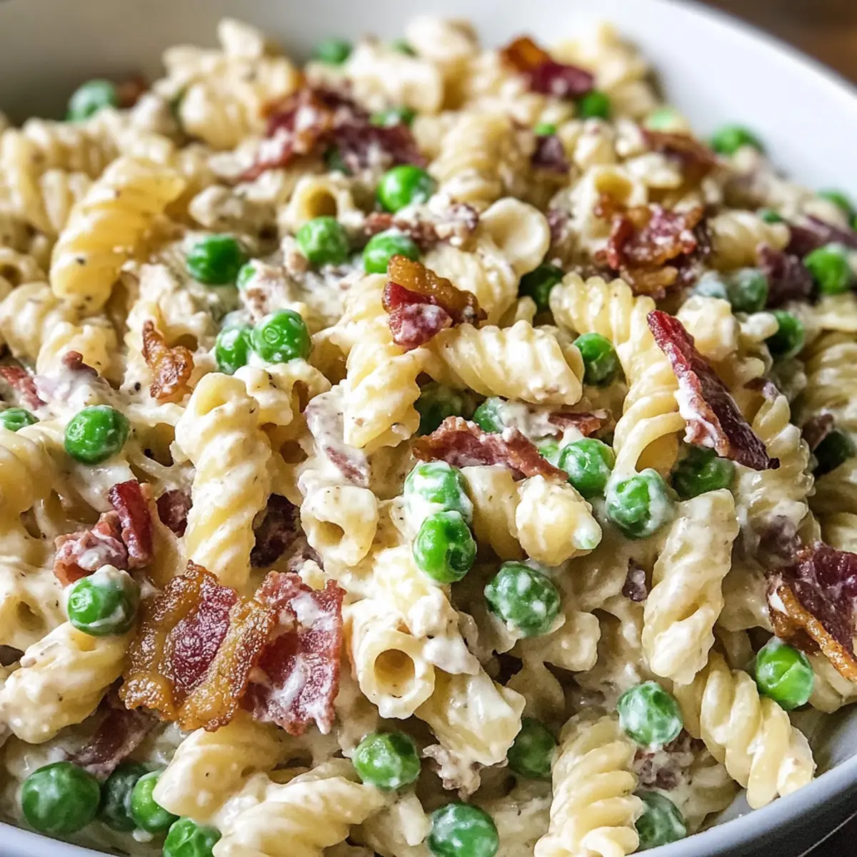 Cremiger Nudelsalat mit Speck und Erbsen