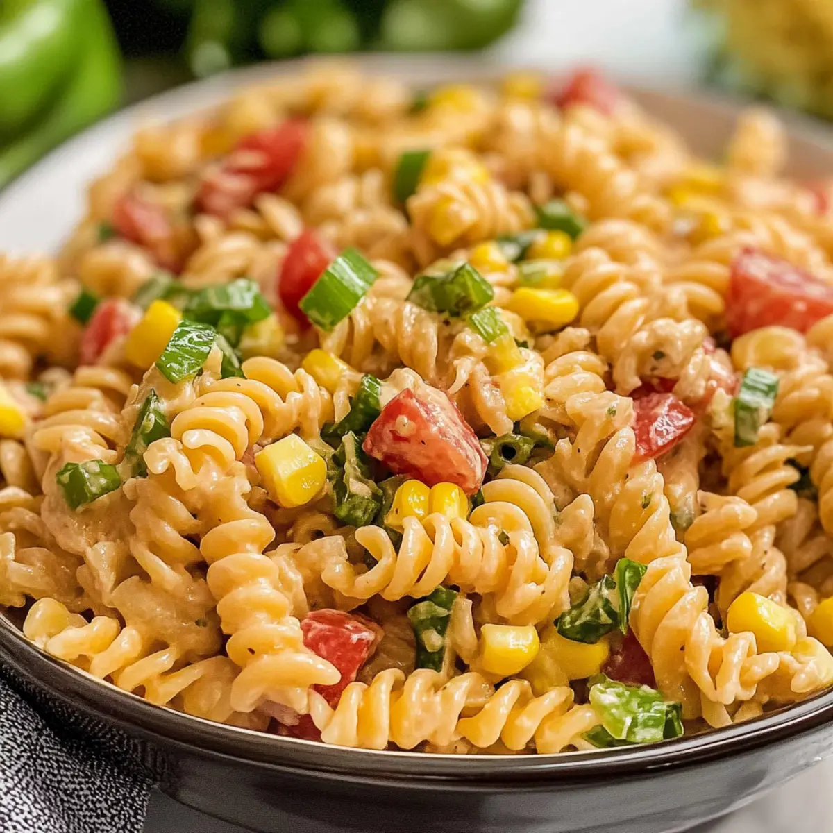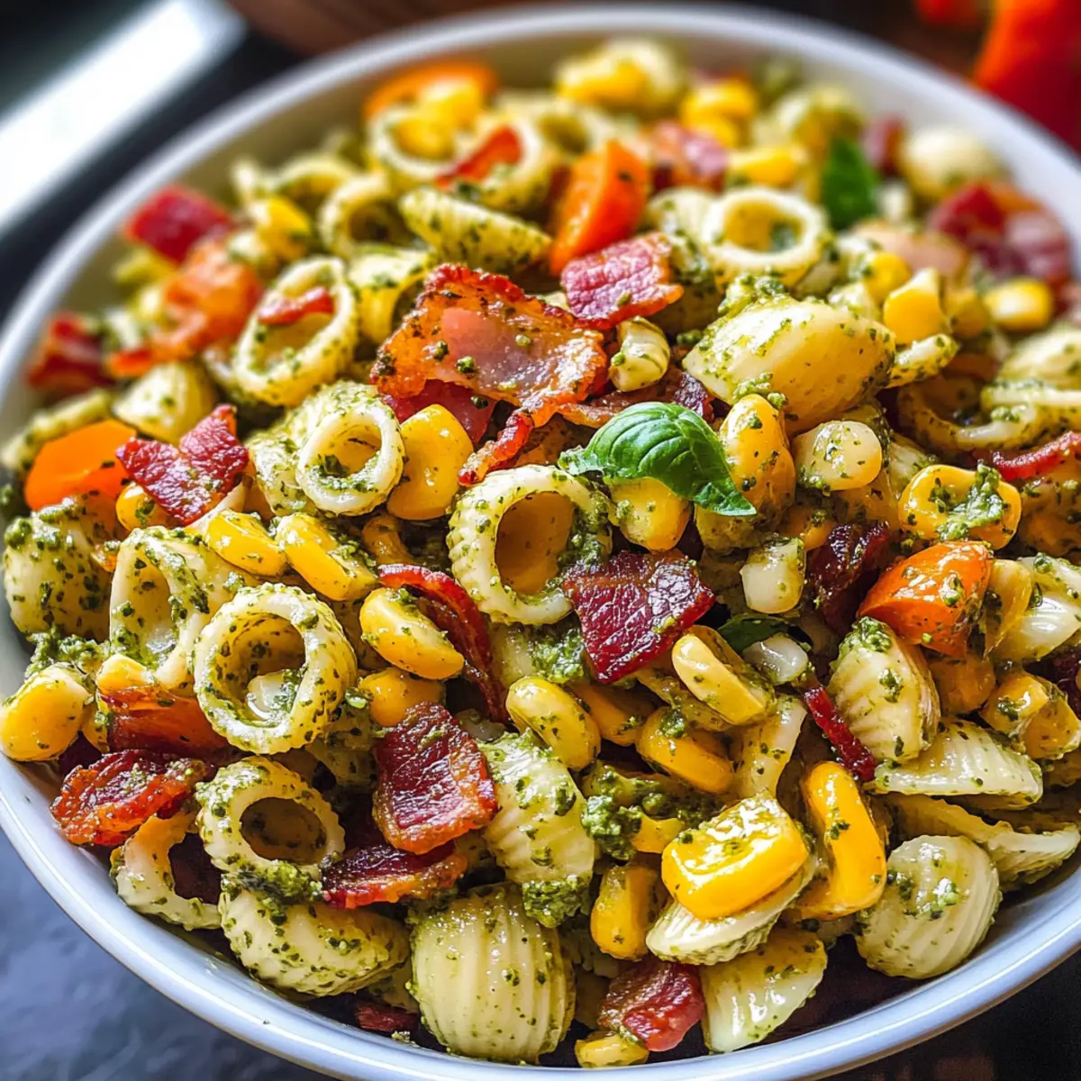 Maissalat mit Pasta und speckigem Pesto-Dressing