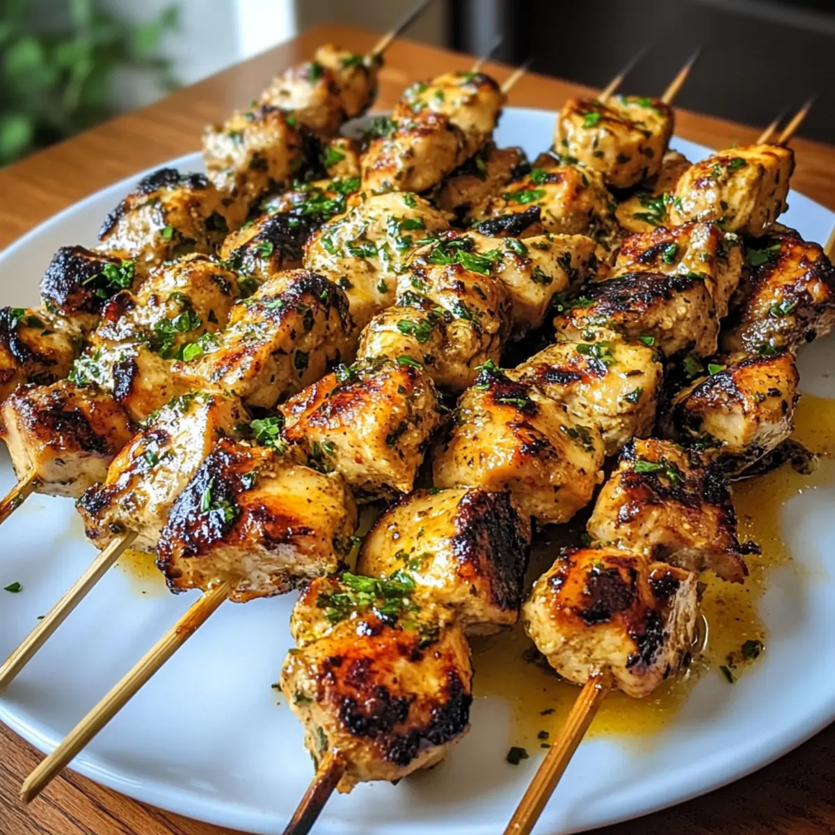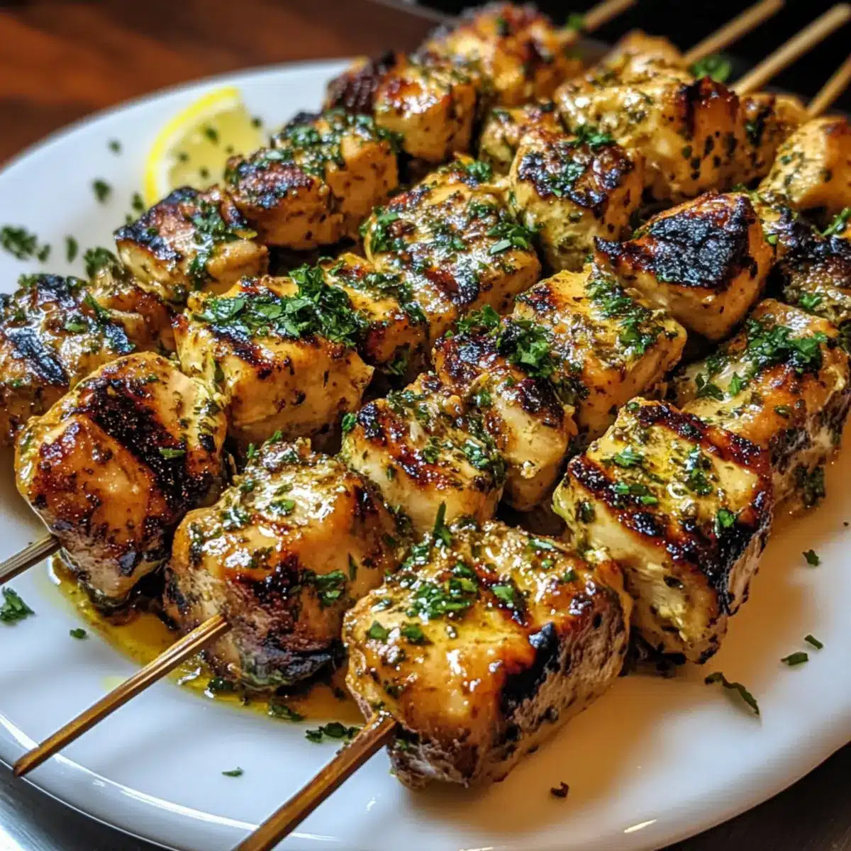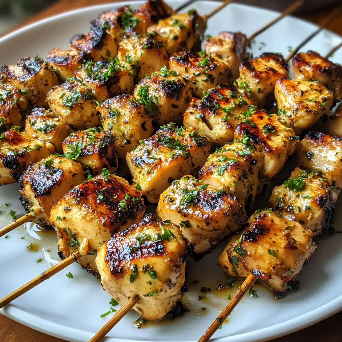 Die Spieße auf den heißen Grill legen und für etwa 10 bis 12 Minuten grillen, dabei regelmäßig wenden, damit sie gleichmäßig garen und die charakteristischen Grillstreifen erhalten. Halte nach einer goldbraunen Farbe und einer Kerntemperatur von 74 °C Ausschau, um sicherzustellen, dass das Hähnchen durchgegart ist und saftig bleibt.