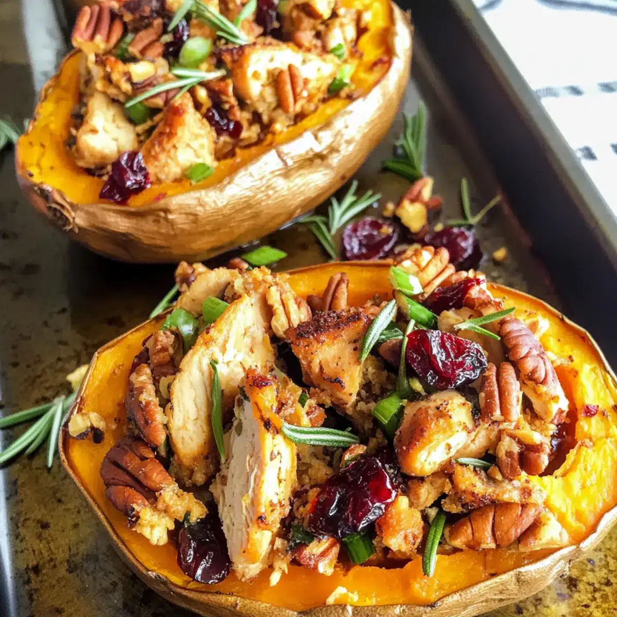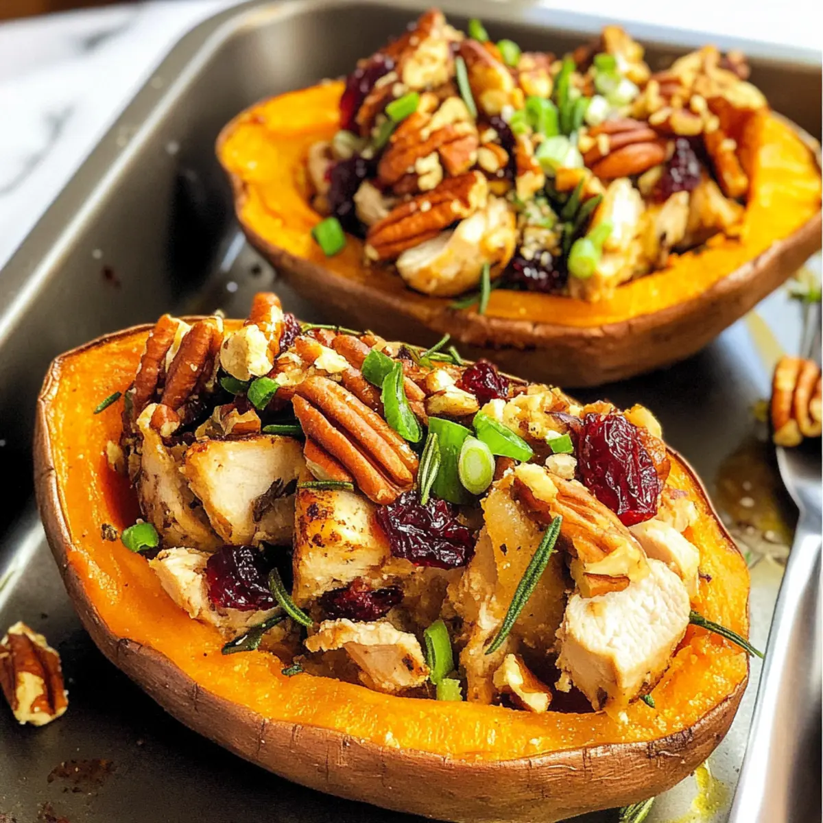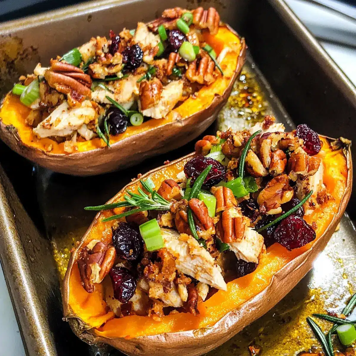 - Jede gebackene Süßkartoffel halbieren und mit der Füllung aus Cranberry-Pekan-Nuss-Hühnchen füllen.