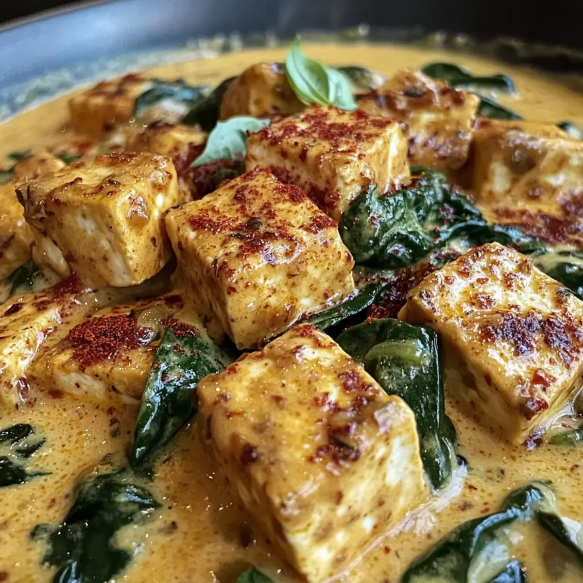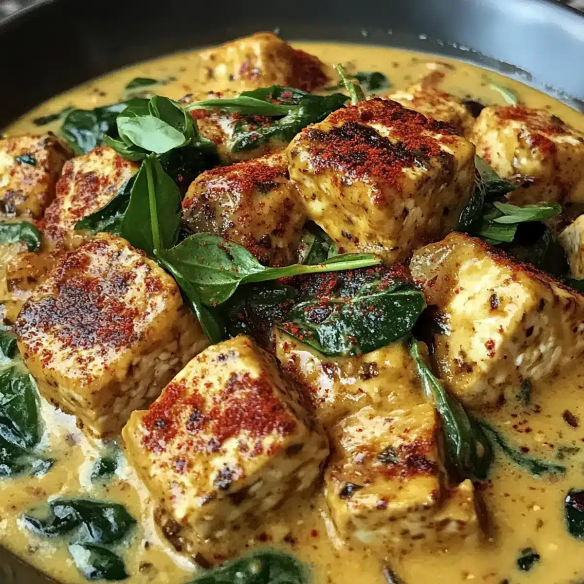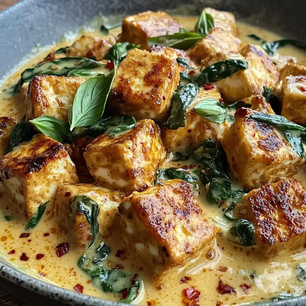 Köstlicher Genuss: Dieser cremige vegane Tofu ist eine harmonische Mischung aus vielversprechenden Aromen und einer einladenden Textur, die jeden Bissen zu einem Erlebnis macht.