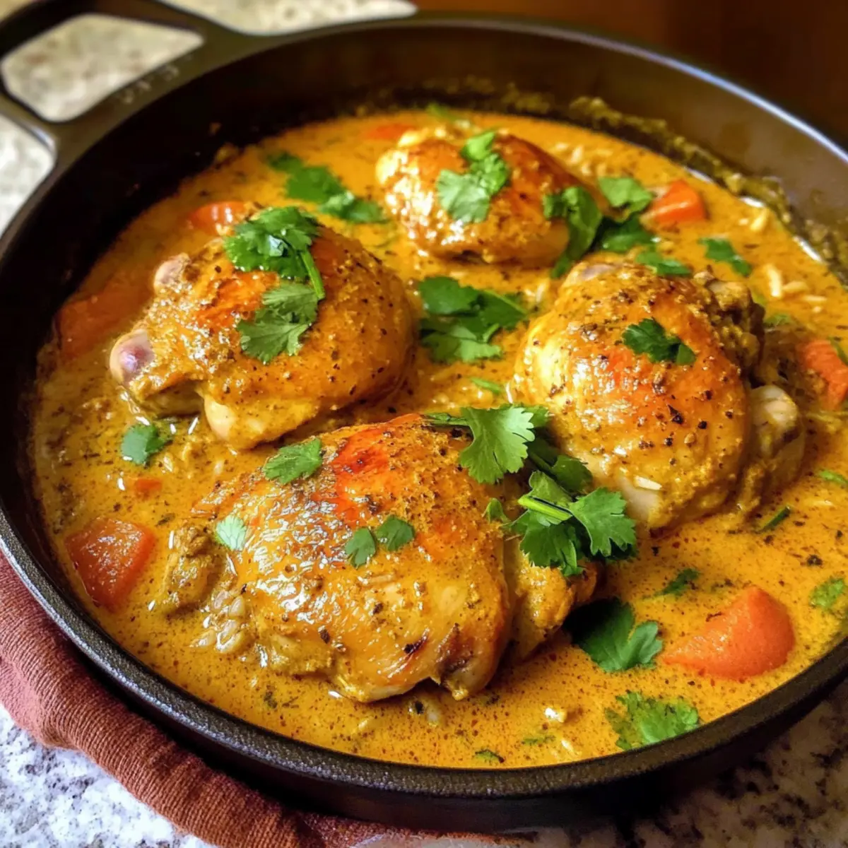 Legt die angebratenen Hühnchenkeulen zurück in die Pfanne und bringt die Mischung zum Kochen. Reduziert die Hitze auf niedrig und deckt die Pfanne leicht ab. Lasst das Gericht 25-30 Minuten lang simmern, bis das Hühnchen vollständig durchgegart ist (165°F).