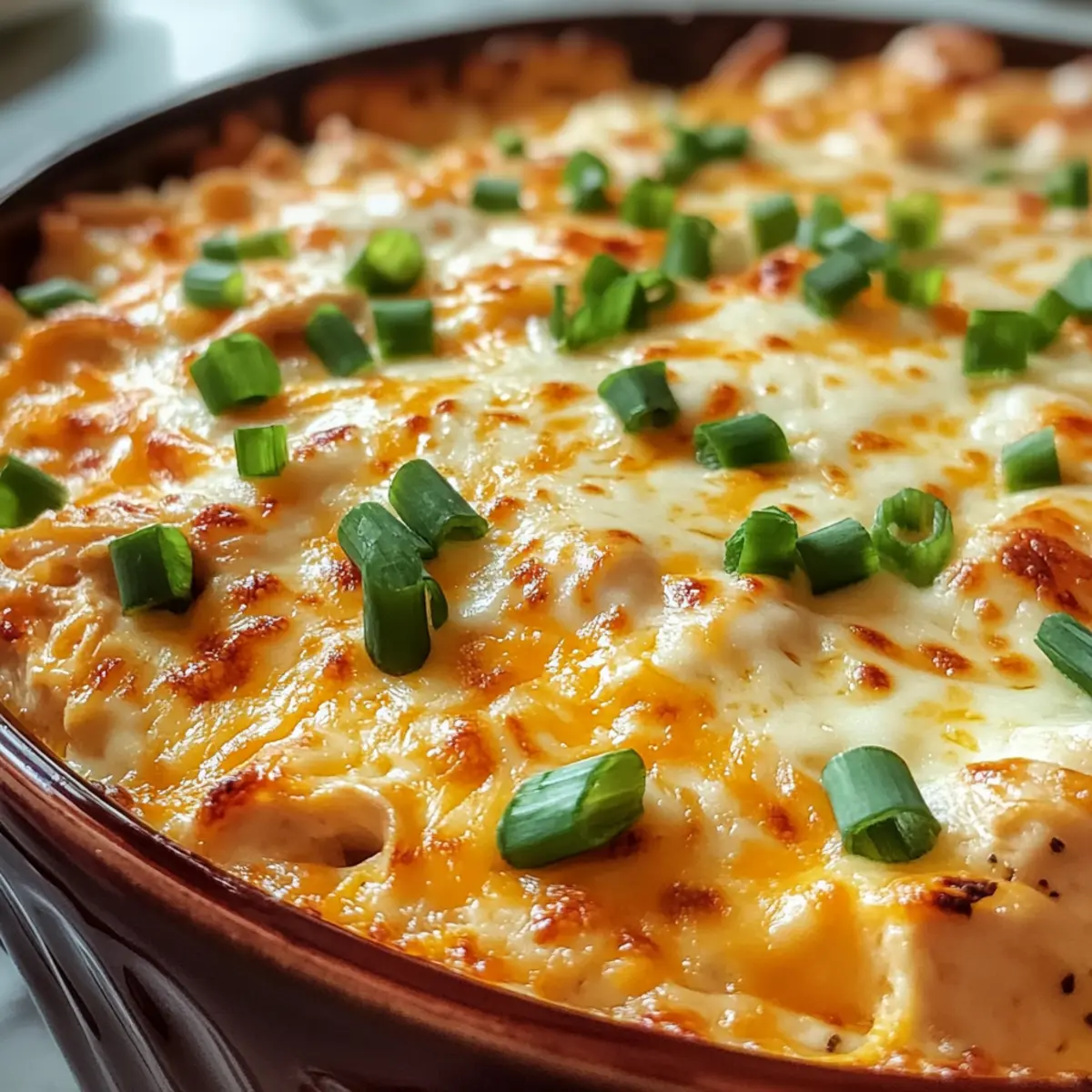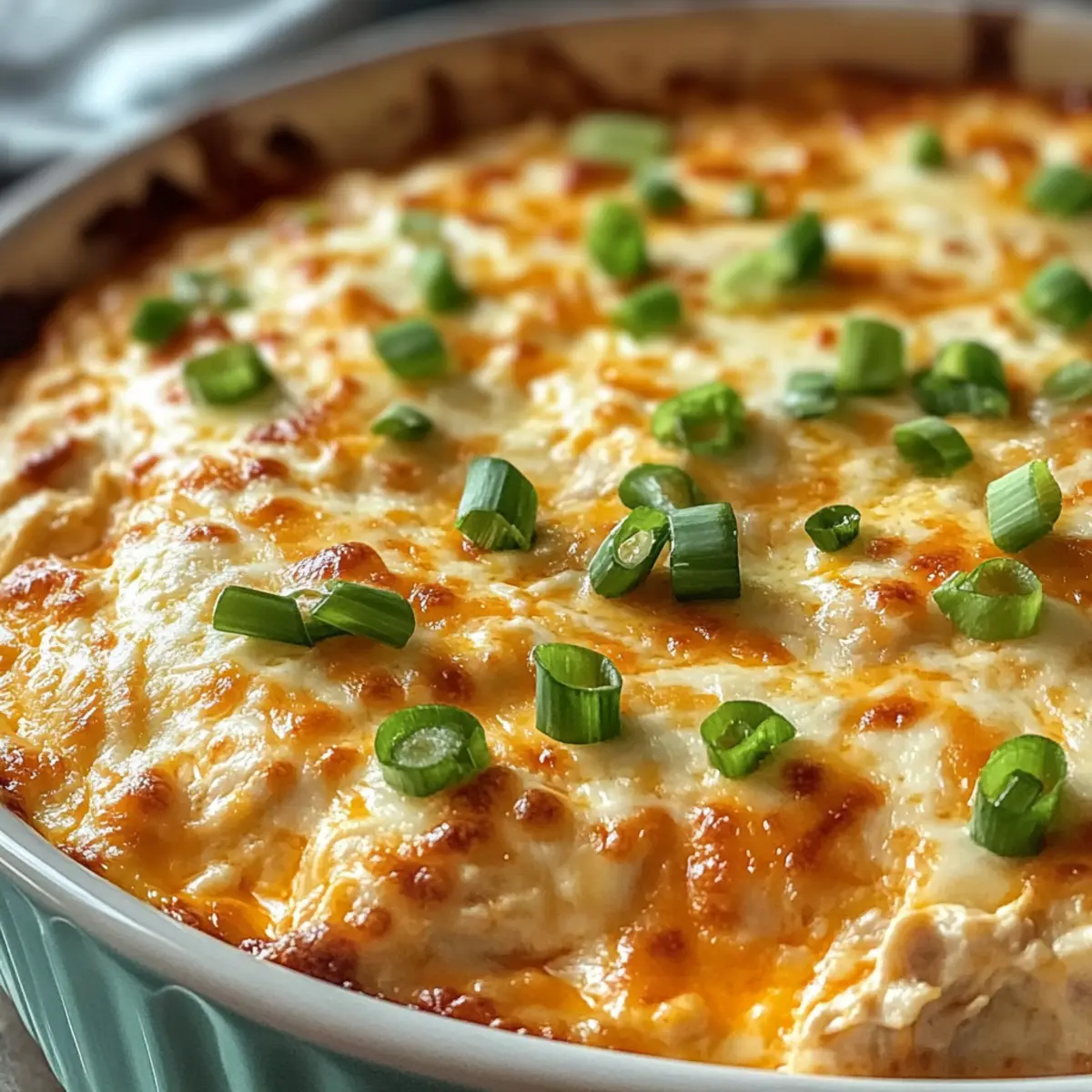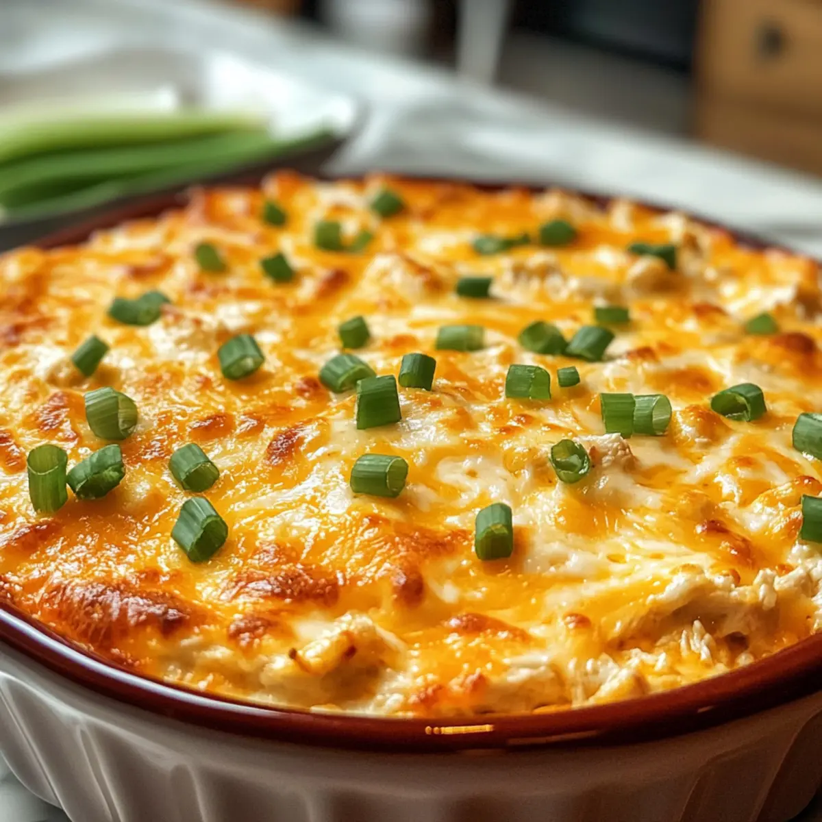 Nehme die Auflaufform aus dem Ofen und lasse den Dip kurz abkühlen. Garniere ihn mit den zur Seite gelegten Frühlingszwiebeln. Serviere den Einfache Buffalo-Hühnchen-Dip sofort, solange er noch schön warm und cremig ist. Du kannst ihn mit Tortilla-Chips, Crackern oder Selleriestangen genießen.