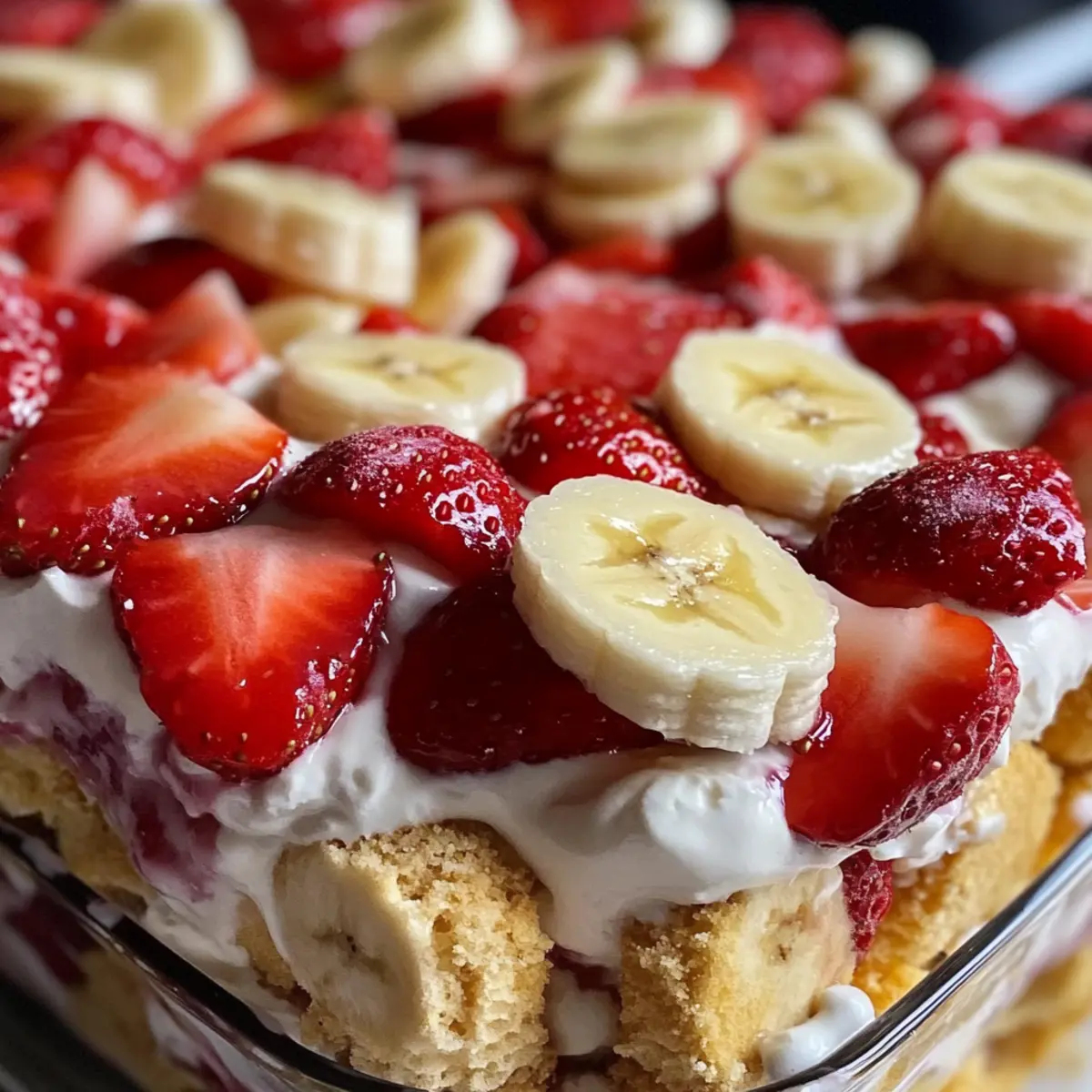 Wiederhole den Schichtvorgang mit den restlichen Vanille Waffeln, gefolgt von den restlichen Bananen und Erdbeeren. Verteilen die Früchte gleichmäßig, um sicherzustellen, dass jeder Bissen gleich viel Frucht erhält. Diese Schichten sorgen für eine schöne Balance zwischen Cremigkeit und Fruchtigkeit.