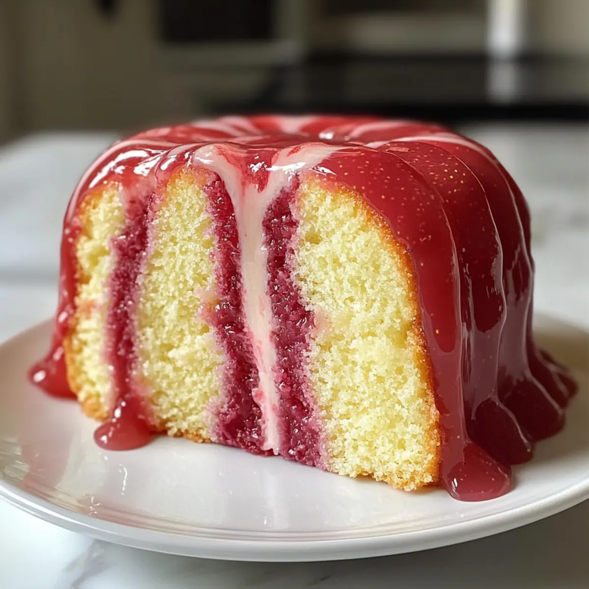Sobald der Erdbeermilchshake-Poundkuchen vollständig abgekühlt ist, träufle die Glasur gleichmäßig darüber. Lass die Glasur etwas herunterlaufen und über die Seiten des Kuchens fließen, um ein appetitliches Aussehen zu erzielen. Jetzt ist dein Kuchen bereit, serviert zu werden!