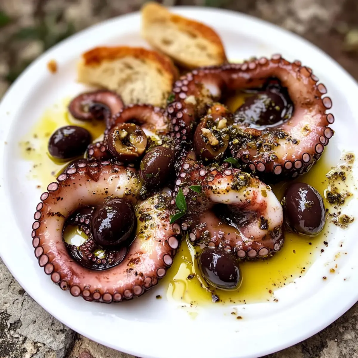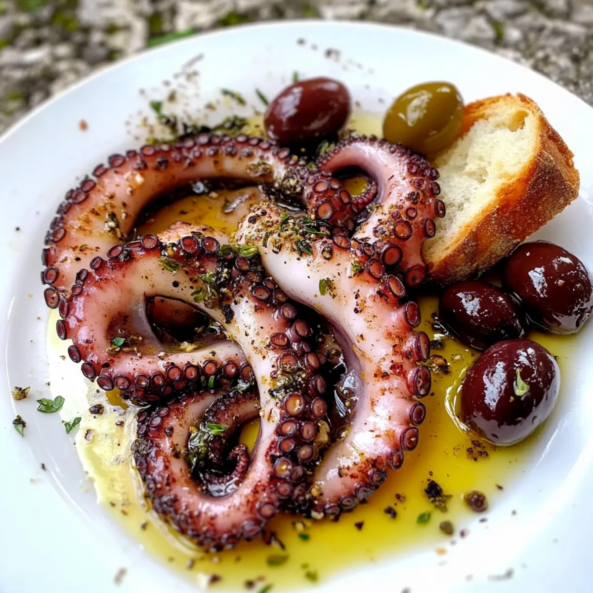 Nehme den marinierten Oktopus aus dem Kühlschrank, lasse überschüssige Marinade abtropfen und richte ihn auf einem schönen Servierteller an. Serviere ihn mit frischen Kalamata-Oliven und knusprigem, gegrilltem Brot. Dieses Gericht bietet eine wunderbare Geschmacksvielfalt und ein authentisches mediterranes Erlebnis.