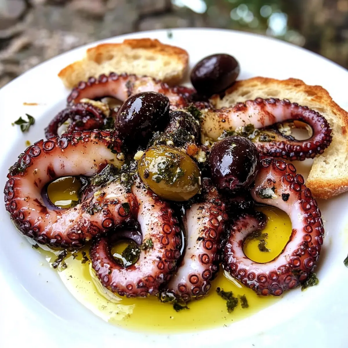 Serviere es warm und geröstet, ideal zum Dippen in die aromatische Marinade des Oktopus. Das knusprige Brot ergänzt die zarte Textur und den intensiven Geschmack. -