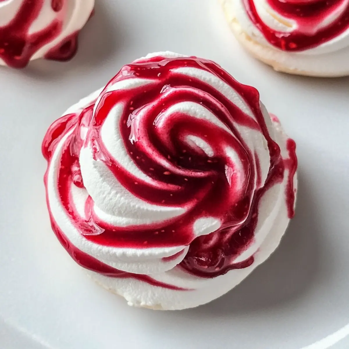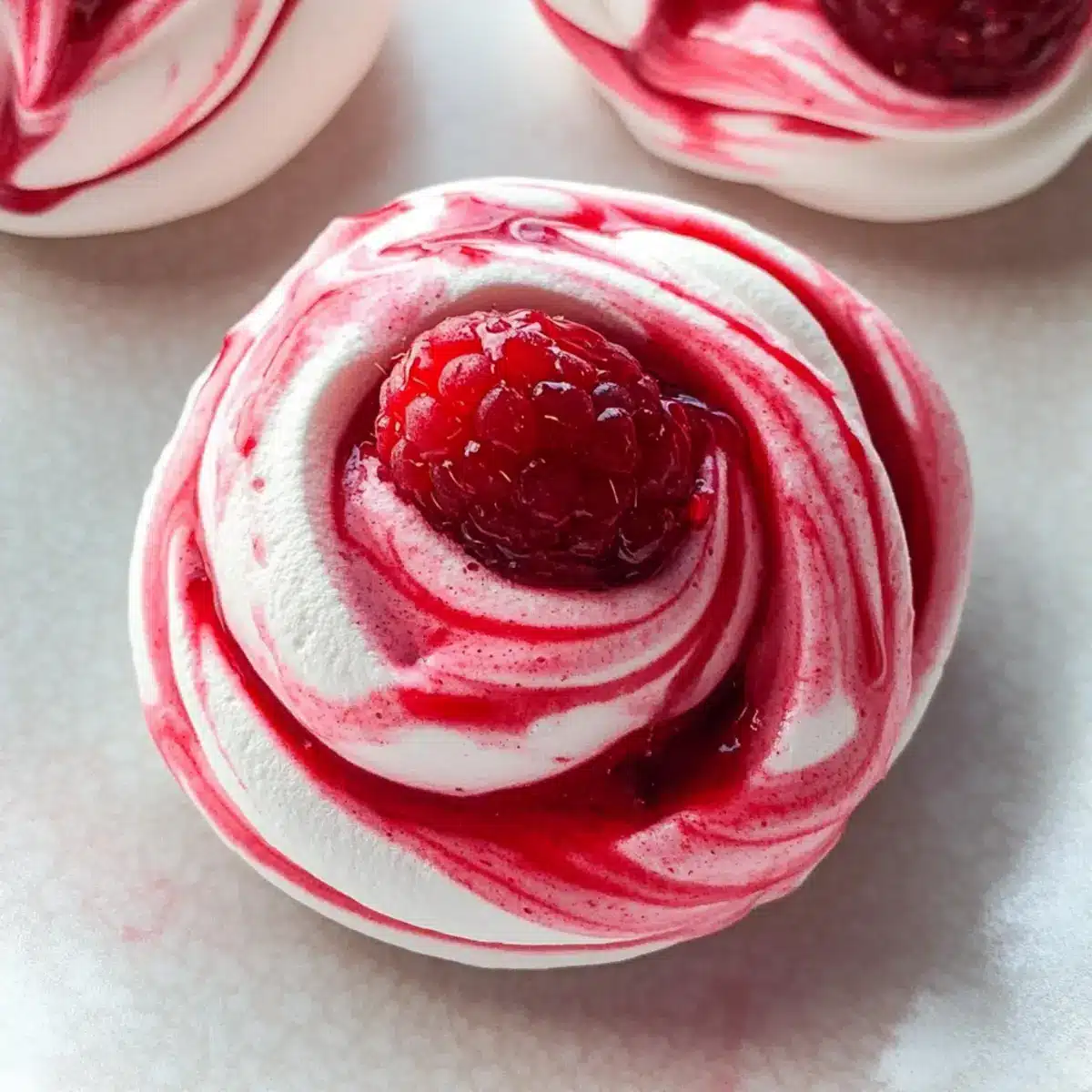Gießen Sie einen kleinen Klecks Himbeer-Coulis auf jedes Meringue-Häufchen. Verwenden Sie einen Holzstäbchen oder einen Zahnstocher, um den Coulis sanft in die Meringue zu swirlen, sodass ein hübsches Muster entsteht. Dies sorgt nicht nur für einen geschmacklichen Kick, sondern sieht auch sehr ansprechend aus.