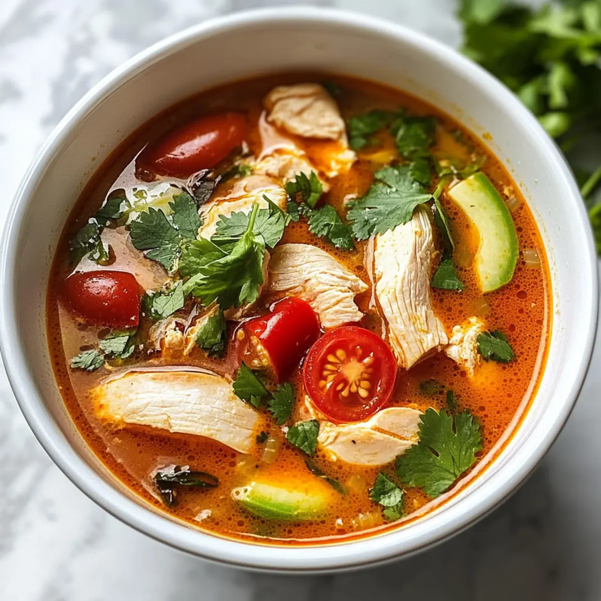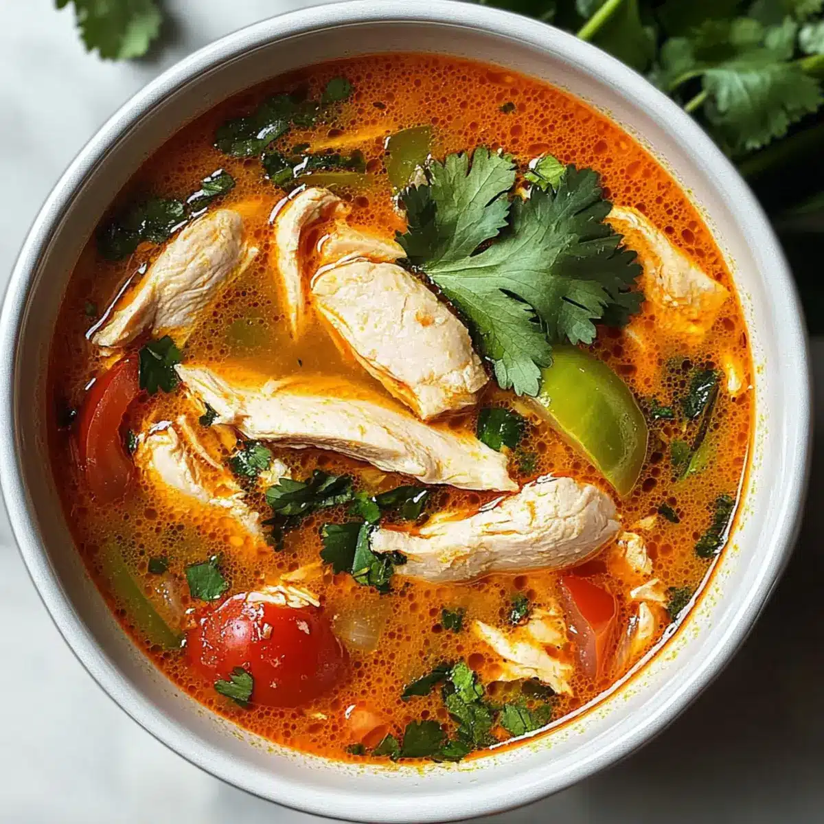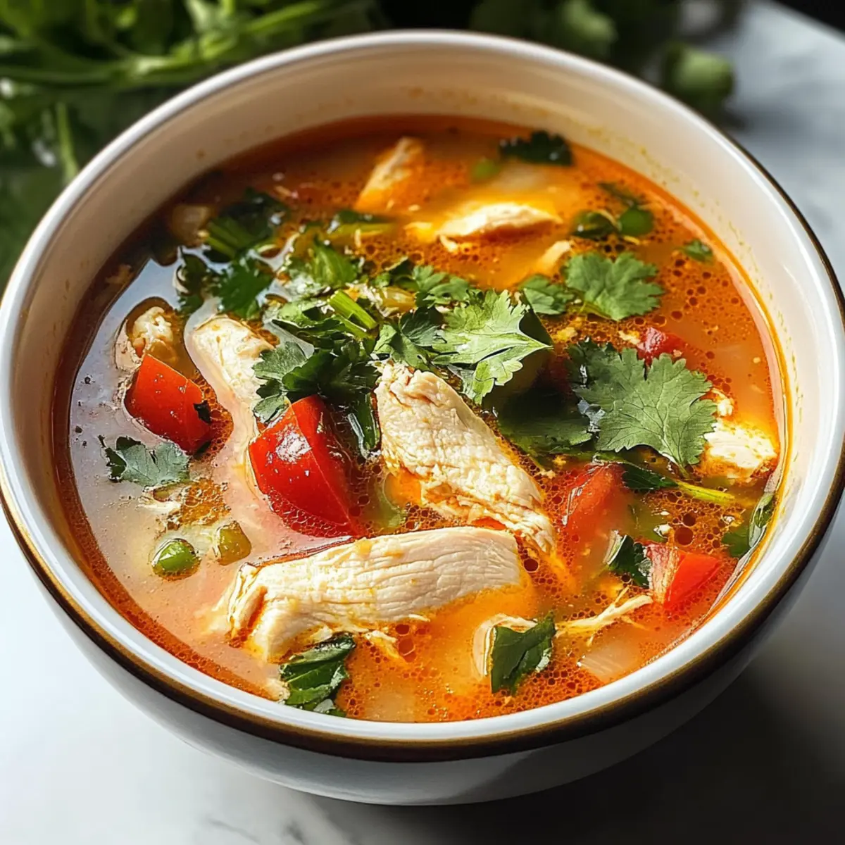 Gib die fertige Suppe in Schalen und garniere sie großzügig mit frisch gehacktem Koriander. Die Suppe heiß servieren und nach Belieben mit etwas zusätzlichem Limettensaft und gerechtem Chili verfeinern. Diese lebendige Hühnchen Tom Yum wird deine Gäste begeistern und für ein wunderbar warmes Gefühl sorgen!