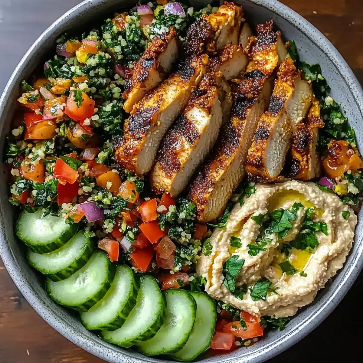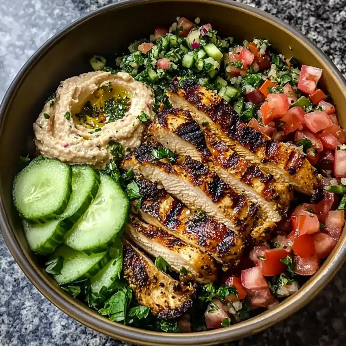 - Schüssel zusammenstellen: Beginne mit Tabbouleh, füge Hühnchen, Hummus, Gurkenscheiben und Rüben hinzu.