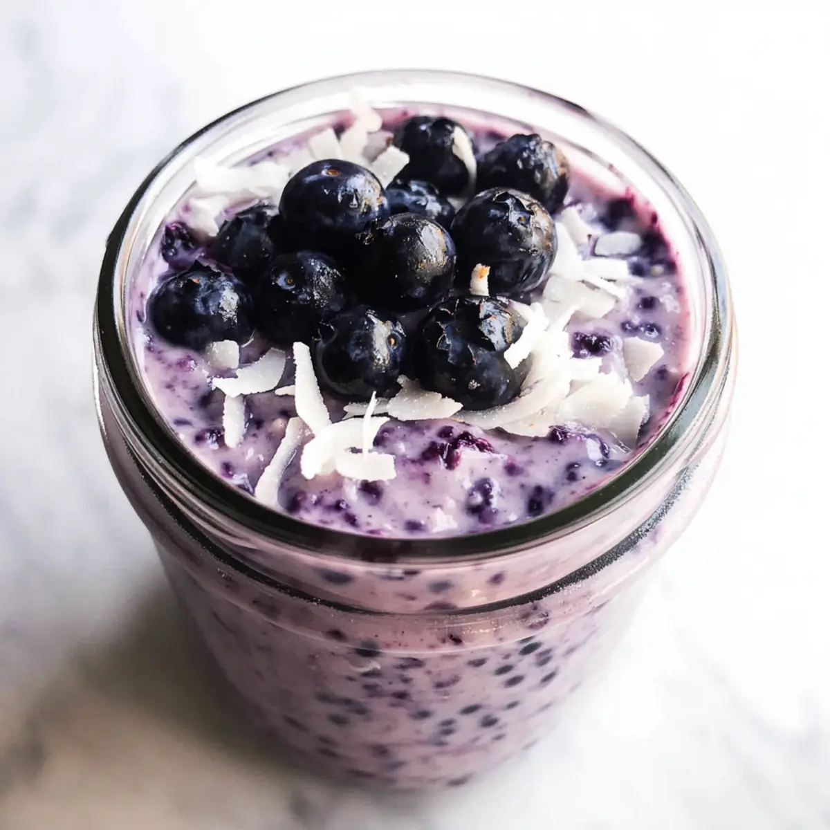 - Nimm die Gläser aus dem Kühlschrank, rühre um und füge nach Bedarf zusätzliche Kokosmilch hinzu. Toppe mit Heidelbeeren und geriebener Kokosnuss.