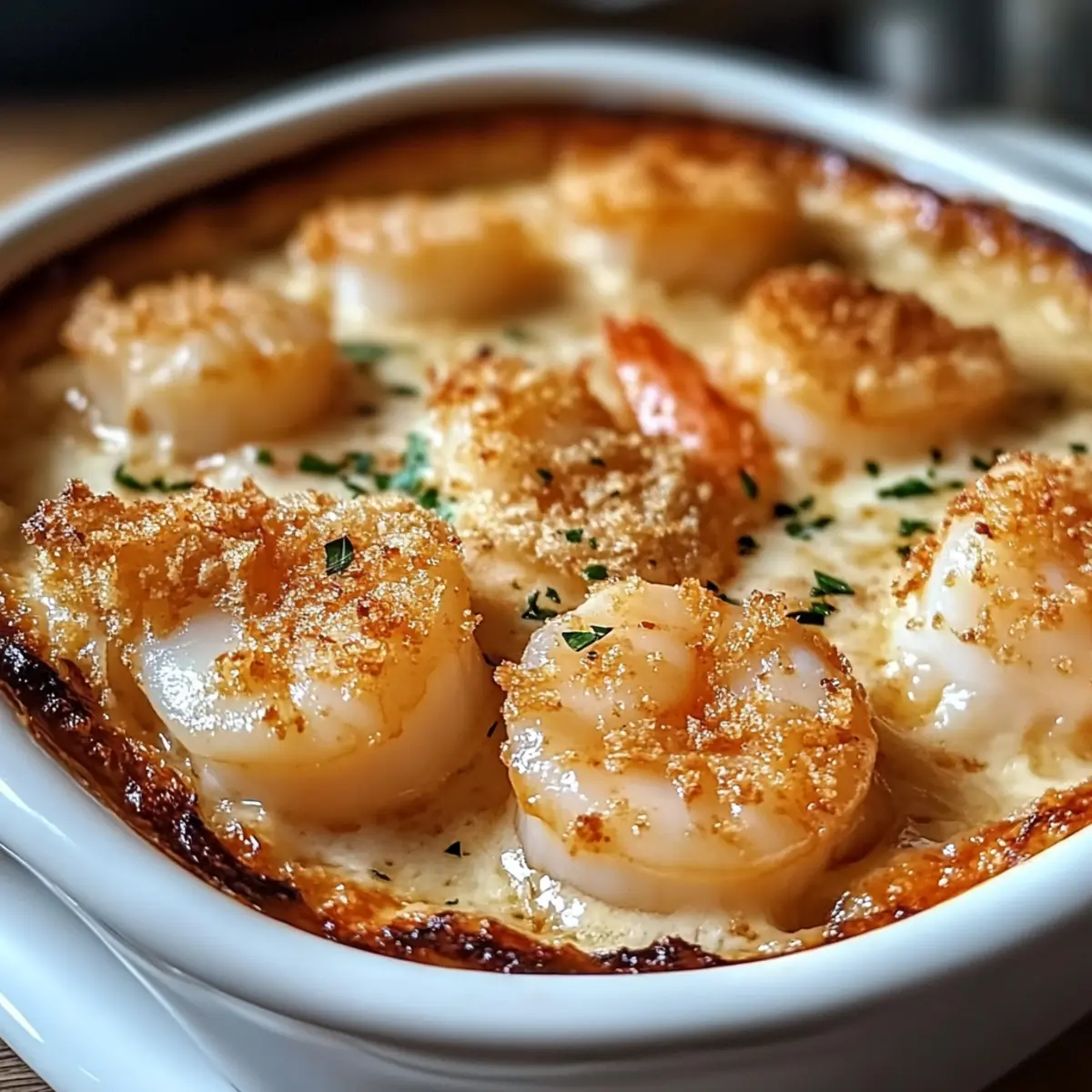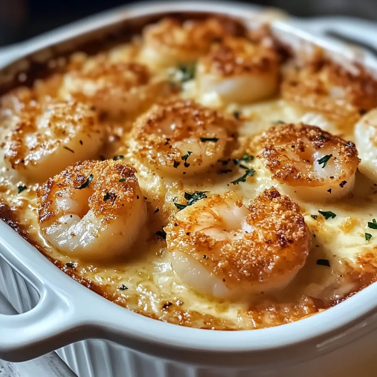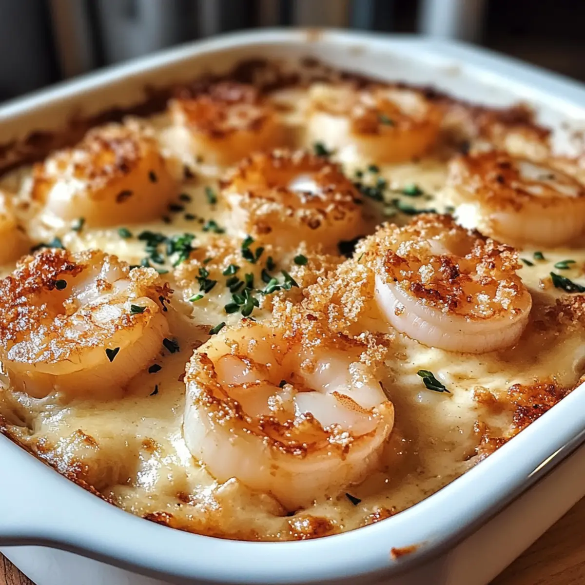 Vielfalt der Aromen: Dieses Meeresfrüchte-Gratin vereint zarte Jakobsmuscheln und saftige Scampi in einer reichhaltigen Béchamelsauce, die jeden Bissen zum Erlebnis macht.