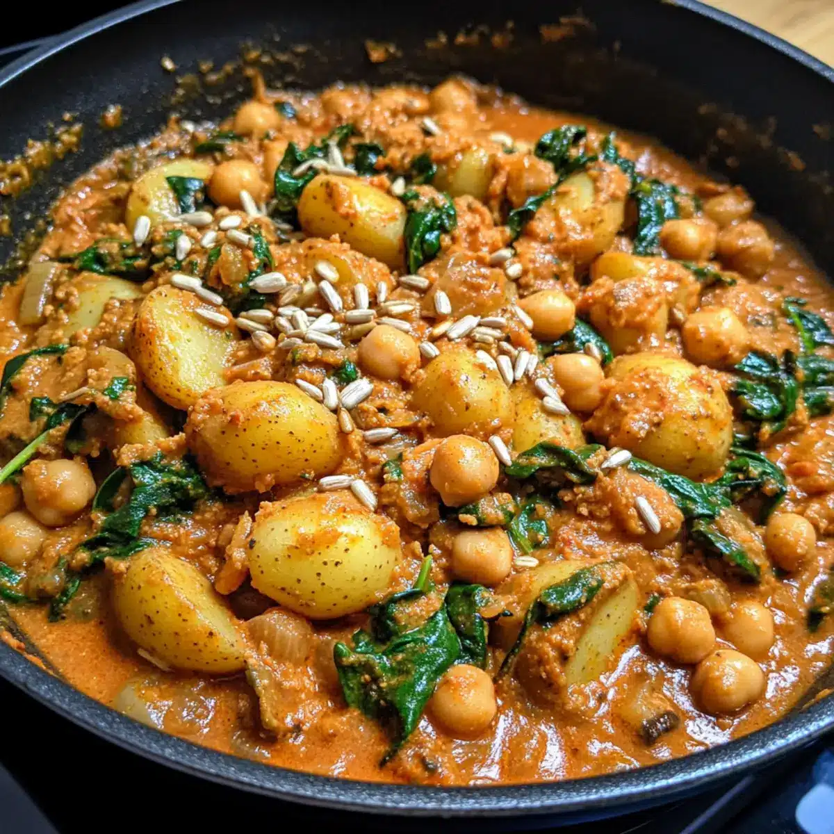 Sobald die Kartoffeln parboiled sind, gieße das Wasser ab und gib die Kartoffeln in die Pfanne mit der Sauce. Rühre die vegane Sahne und den gehackten Spinat hinein. Lass alles für weitere 5 Minuten auf niedriger Hitze köcheln, bis der Spinat zusammengefallen ist und die Sauce cremig und ansprechend aussieht.