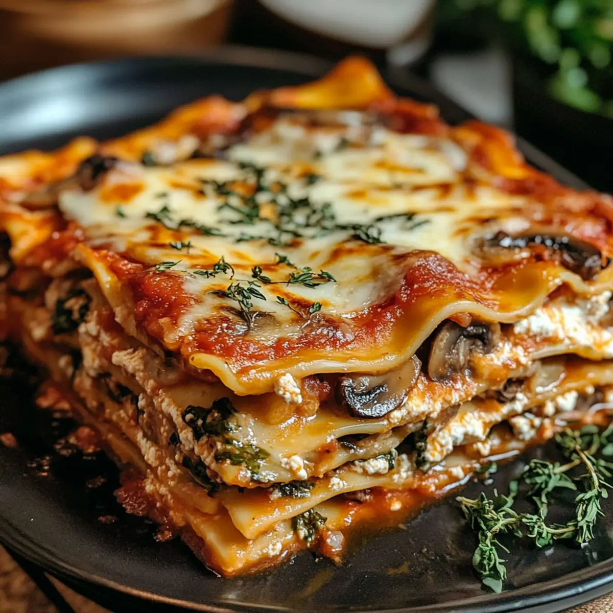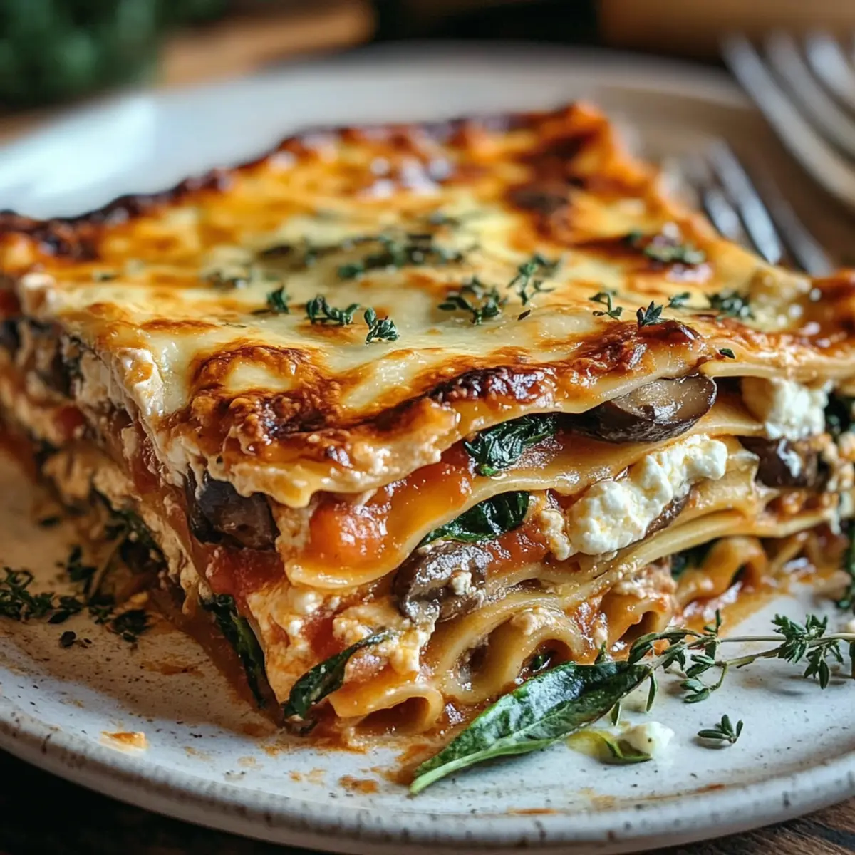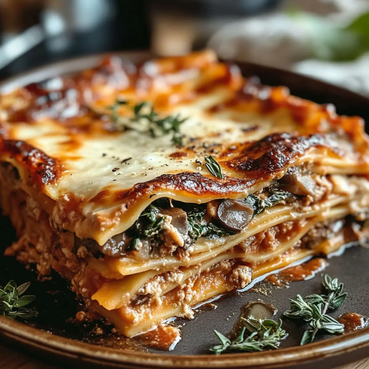 Herzhaftes Vergnügen: Diese Lasagne vereint cremige Texturen und herzhaftes Aroma von Pilzen und Spinat, was sie zu einem unwiderstehlichen Hauptgericht macht.