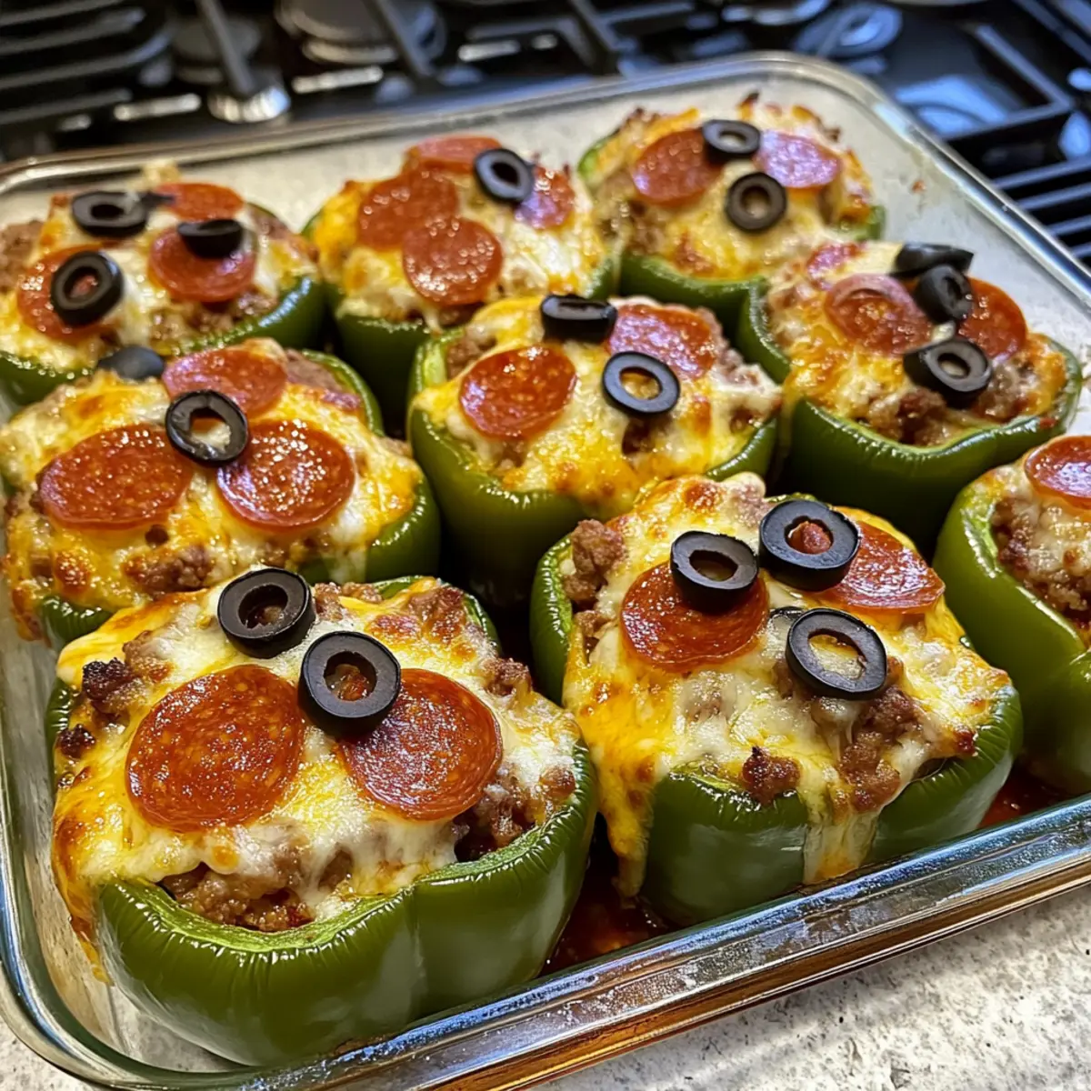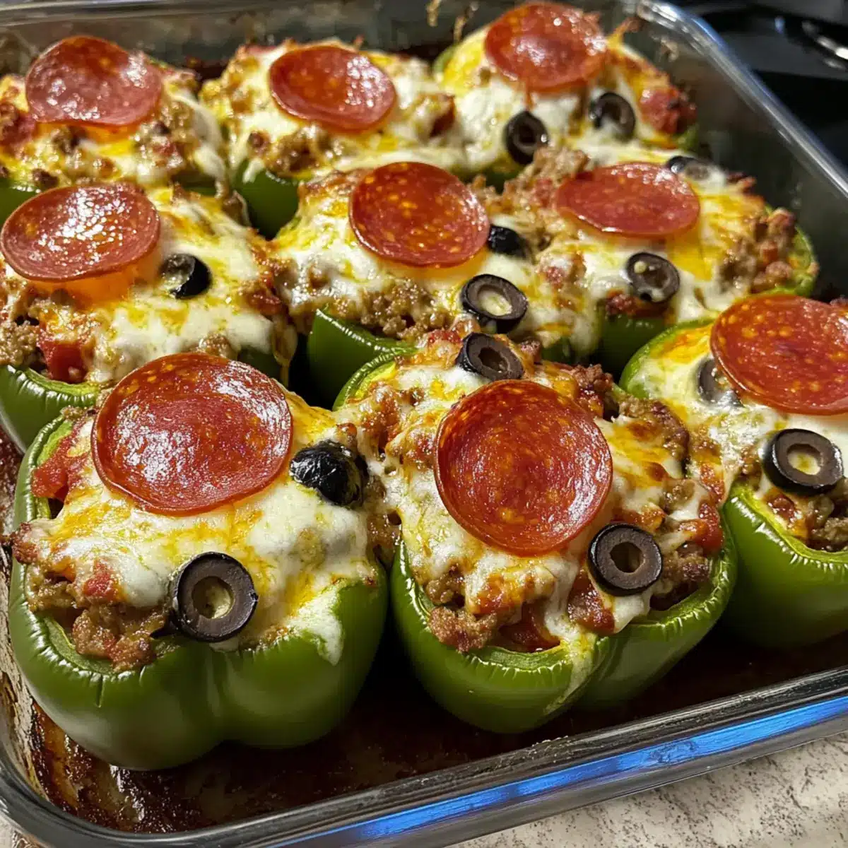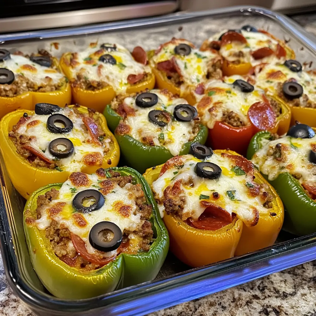Bestreue die gefüllten Paprika abschließend mit dem geriebenen Mozzarella, den Pepperoni-Scheiben und den Oliven. Bedecke das Backblech mit Alufolie und stelle es in einen vorgeheizten Ofen bei 180°C (350°F) für 20-30 Minuten. Die Paprika sollen zart werden, aber ihre Form behalten.