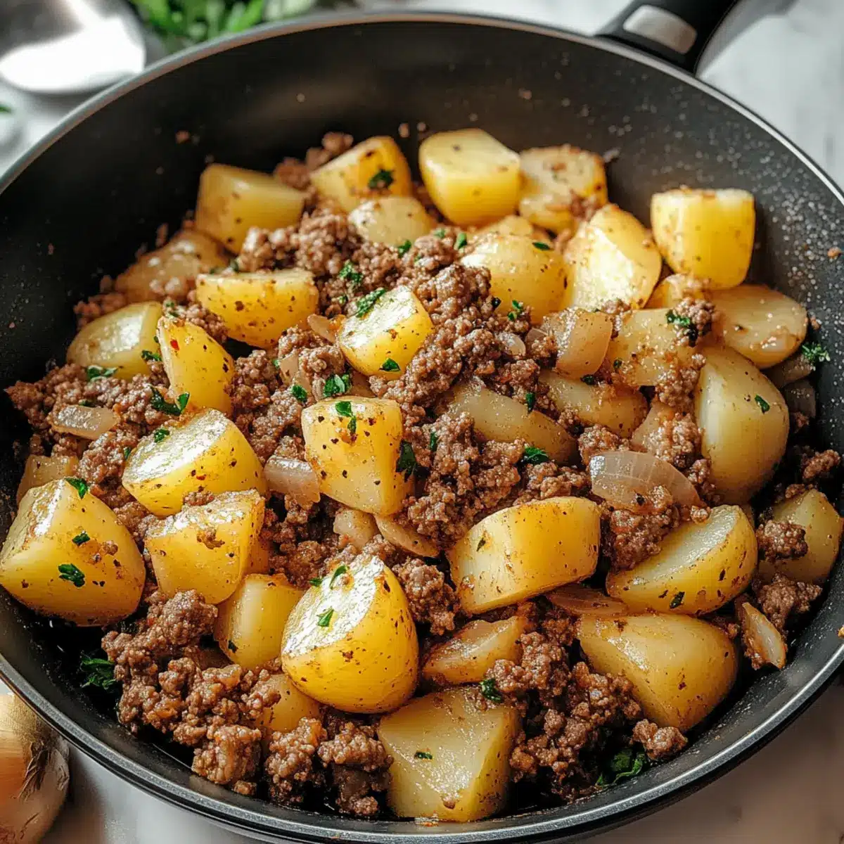 Einfaches Rindfleisch und Kartoffeln aus der Pfanne