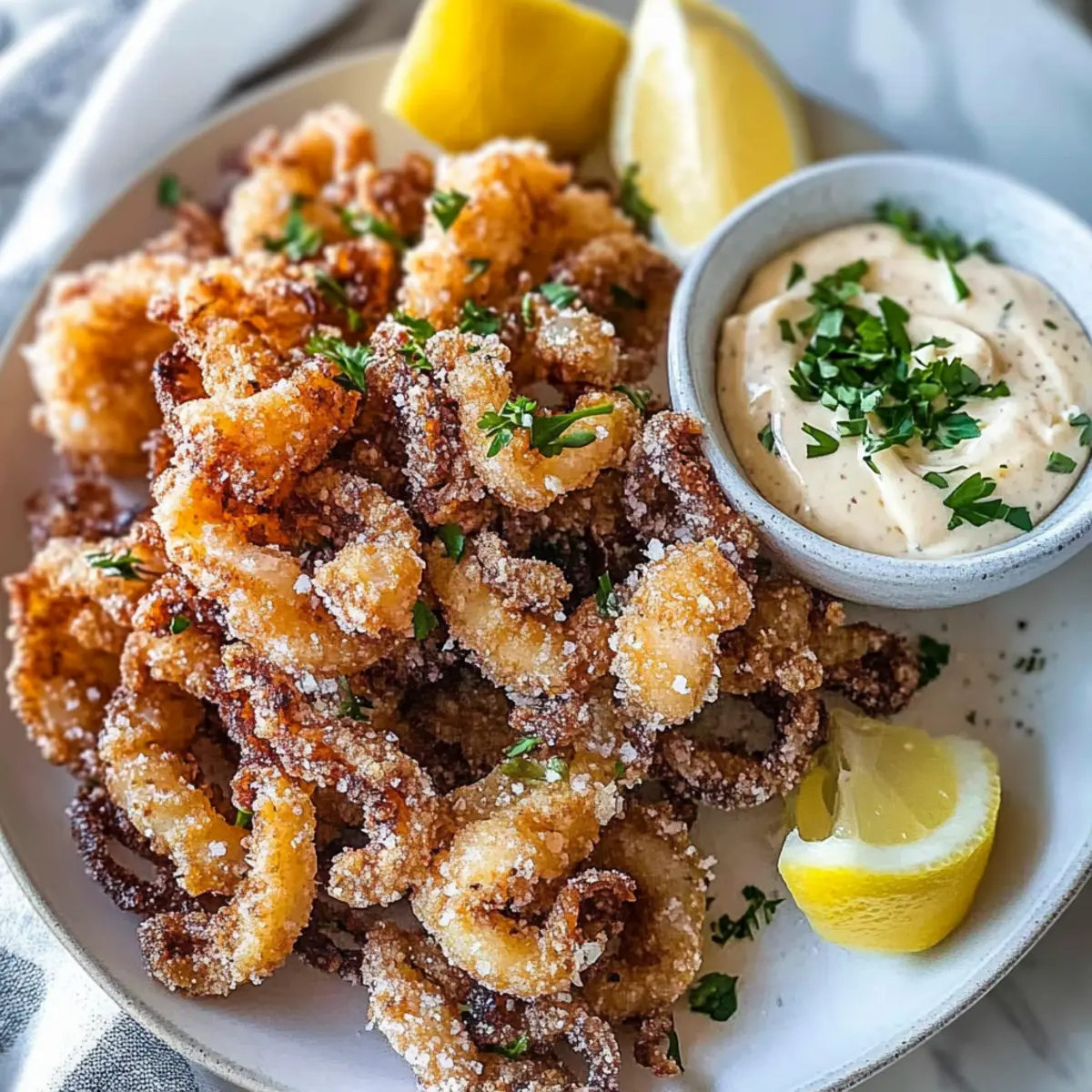 Frisch und Aromatisch: Der Geschmack der goldbraun frittierten Calamari wird durch einen Spritzer Zitronensaft und eine cremige Knoblauchmayonnaise perfekt ergänzt.