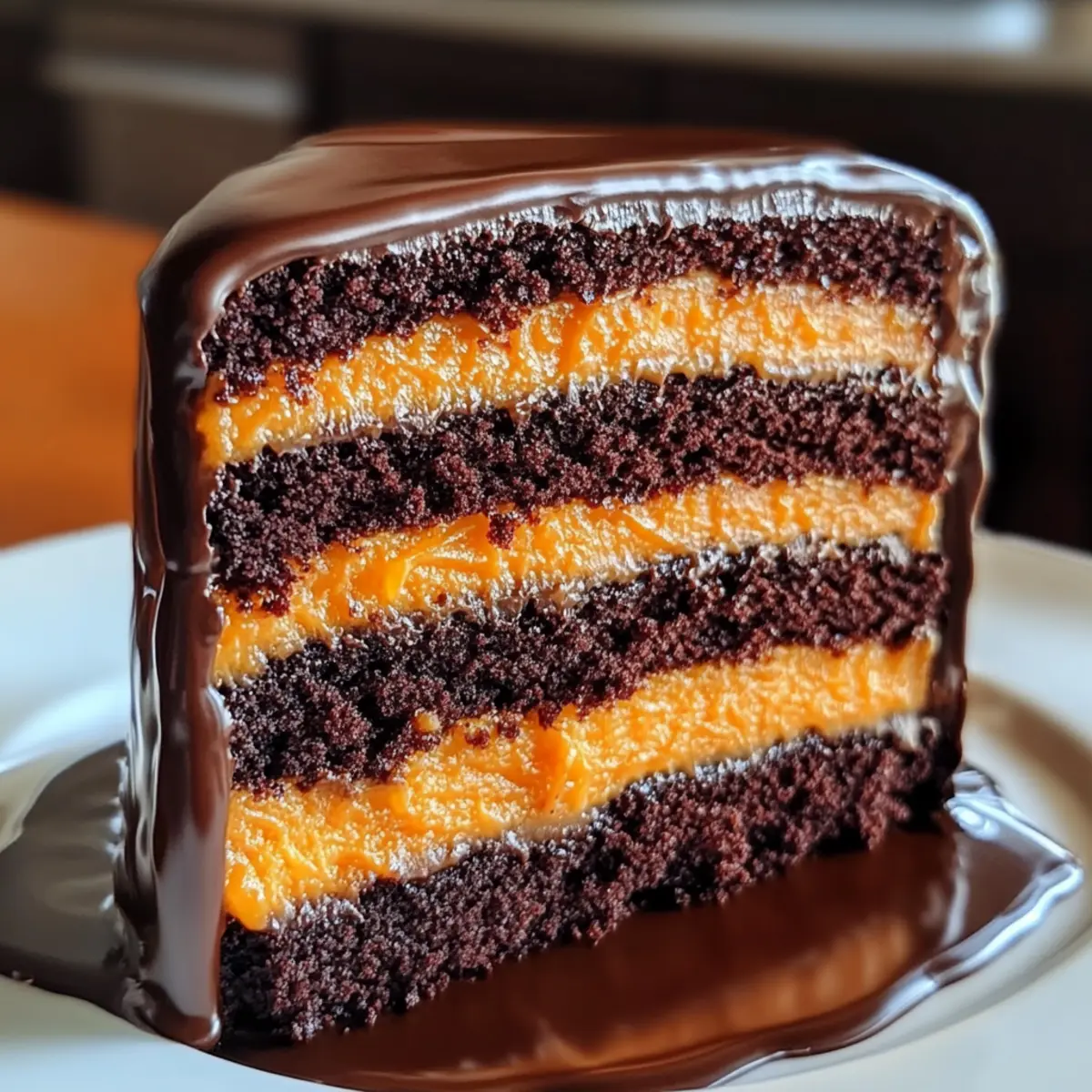 - Baue den Kuchen auf, indem du die Orangensahnefüllung zwischen die Kuchenschichten schichtest und die Ganache obendrauf gibst.