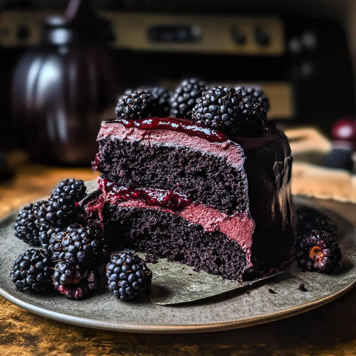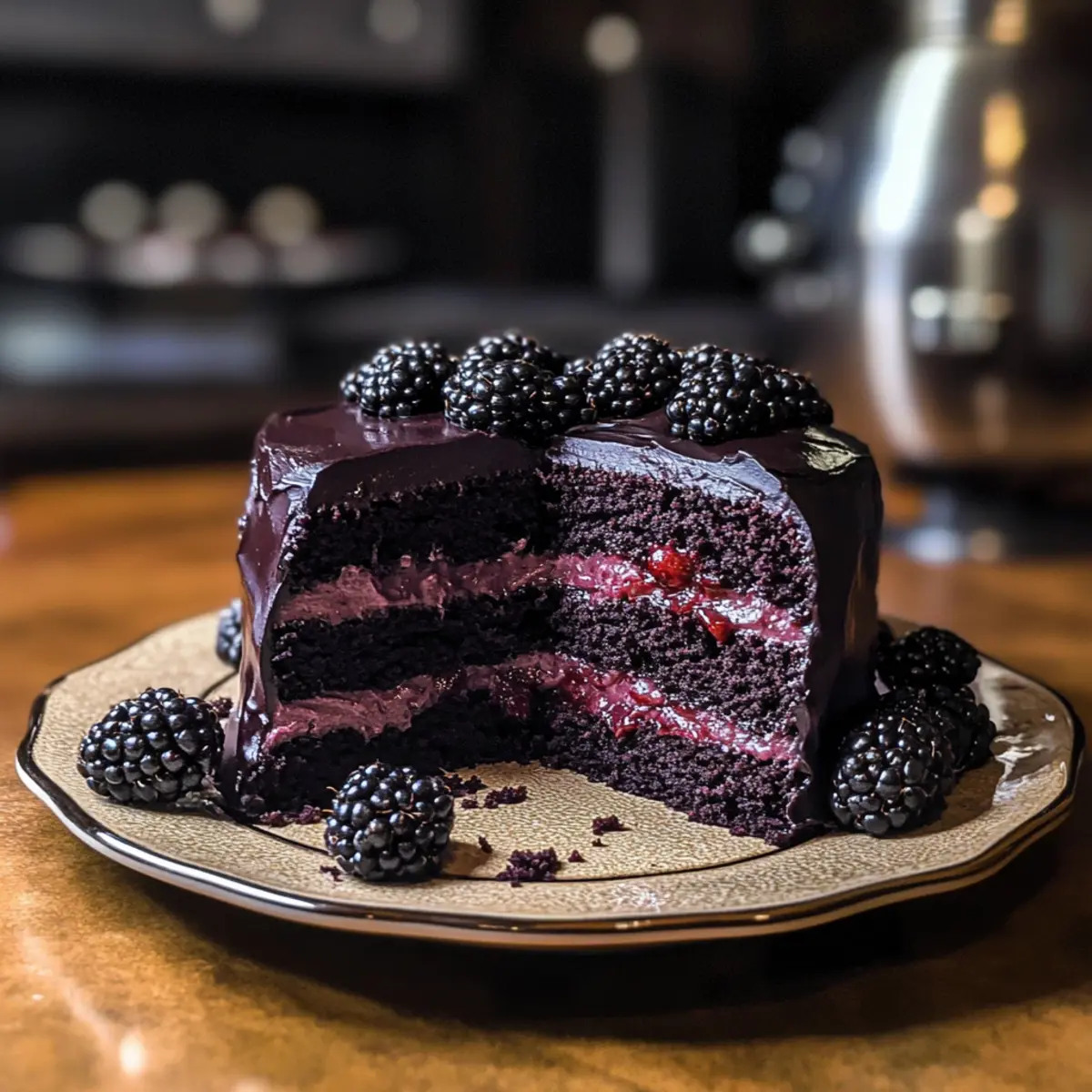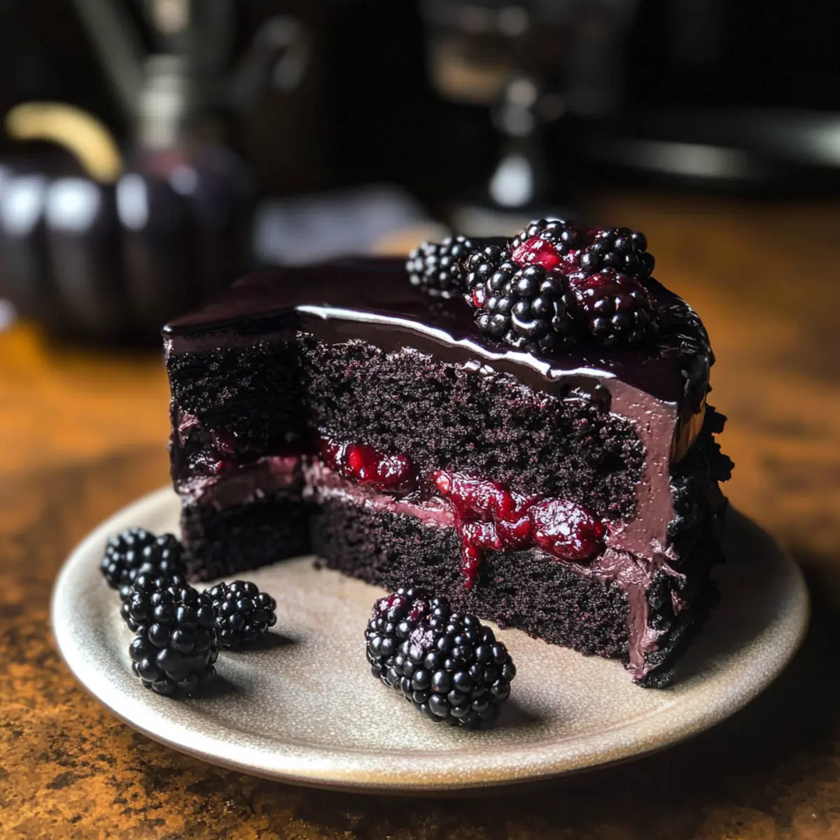 Einzigartiger Genuss: Der Spooky Black Velvet Halloween Cake bietet eine beeindruckende Kombination aus lieblichem Schokoladengeschmack und herzhaft fruchtiger Brombeerfülle, die jeden Gaumen verzaubert.