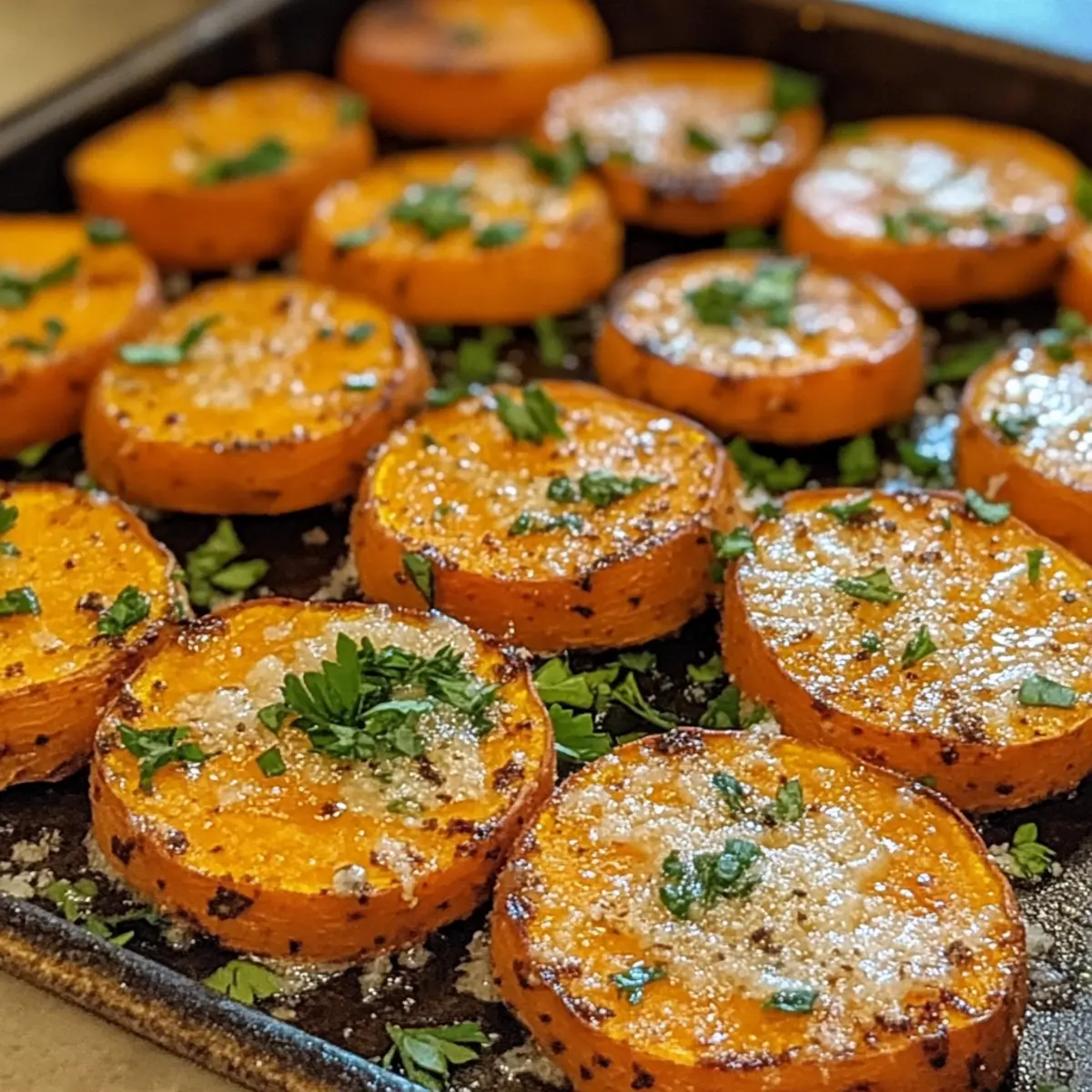Nehme die Süßkartoffelmedaillons aus dem Ofen und lasse sie kurz abkühlen. Garniere sie mit frisch gehackter Petersilie für einen Farbtupfer und zusätzliche Frische. Diese köstlichen Medaillons sind jetzt bereit, serviert zu werden – perfekt als Beilage oder sogar als Hauptgericht!