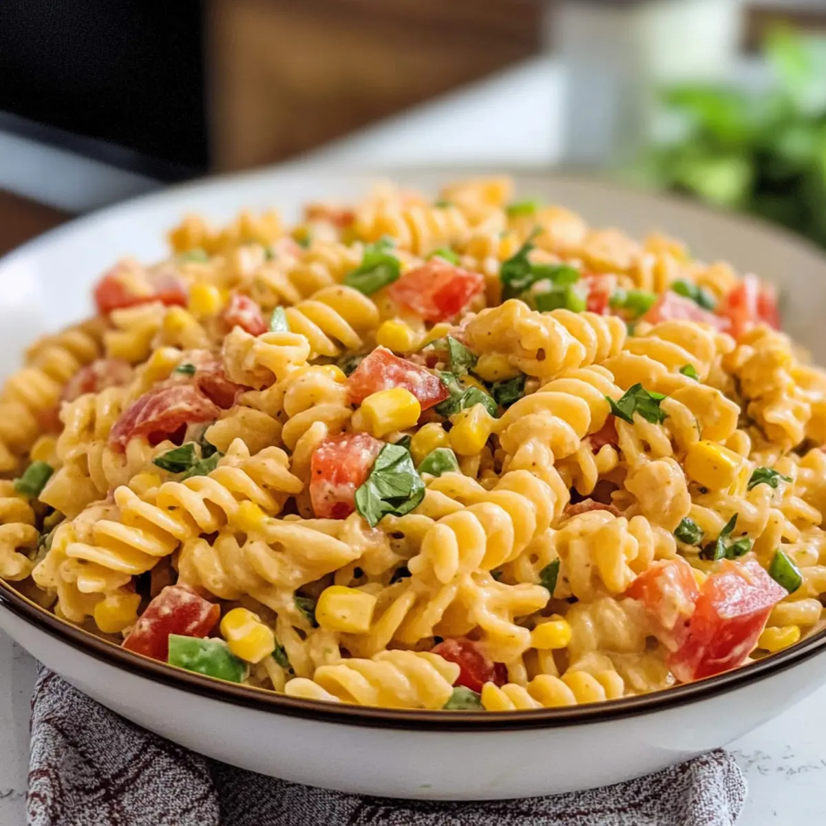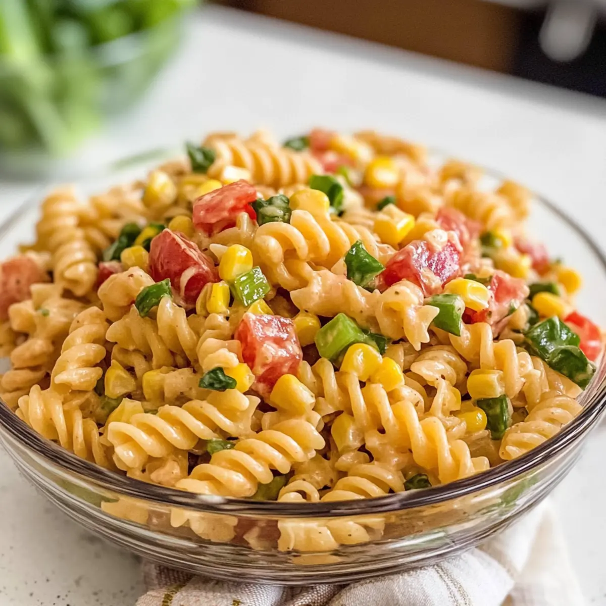Füge die gewürfelten Frühlingszwiebeln, die rote Paprika, den Mais und die mexikanische Käsemischung hinzu. Mische alles sanft, indem du die Zutaten vorsichtig unter die Pasta hebst. Du solltest eine farbenfrohe und ansprechende Mischung sehen, die zeigt, dass dein Taco Pasta Salat bereit ist für den nächsten Schritt.