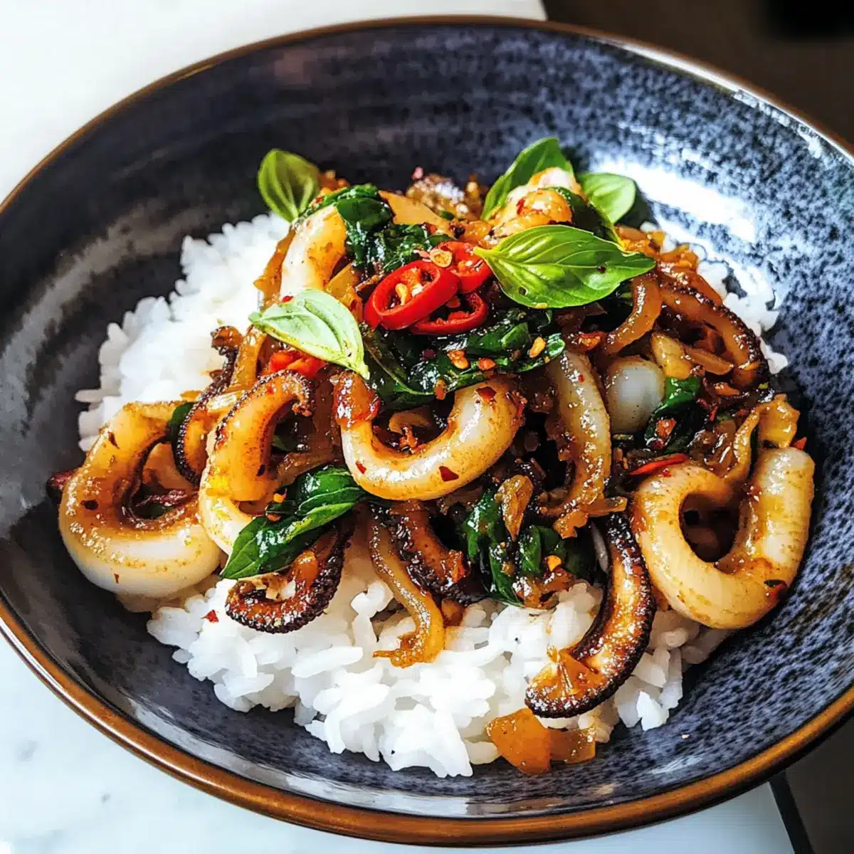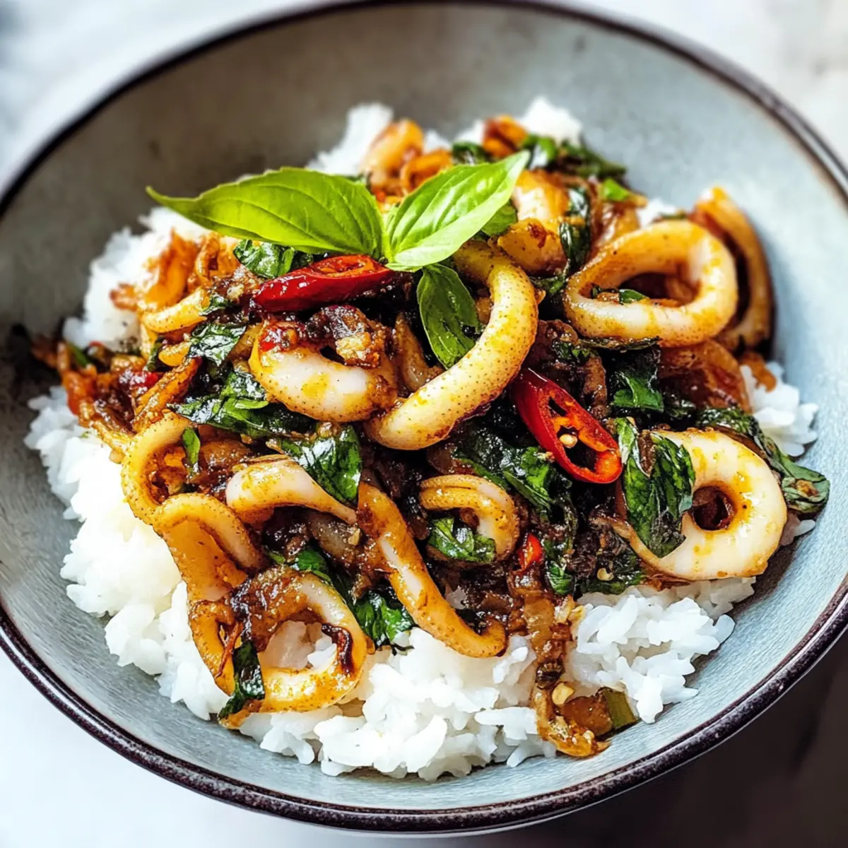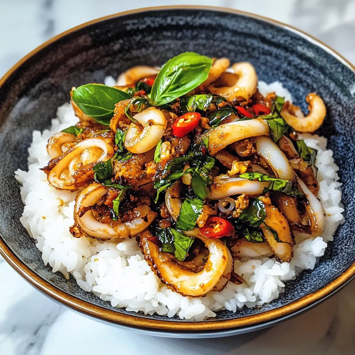 - Serviere den Thai-Basilikum-Tintenfisch über einer Portion gekochtem weißen Reis und garniere mit gehackten Frühlingszwiebeln.