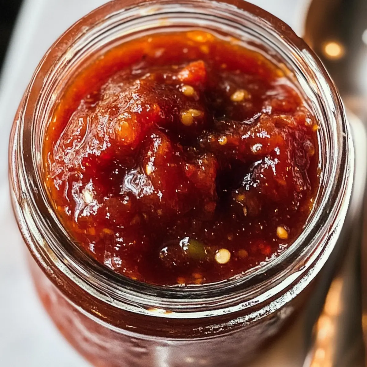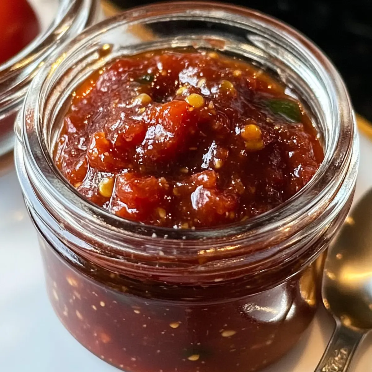 Makellose Textur: Die Marmelade hat eine perfekte Balance aus dicker, glänzender Konsistenz und chunkigen Tomatenstücken – ein wahrer Genuss!