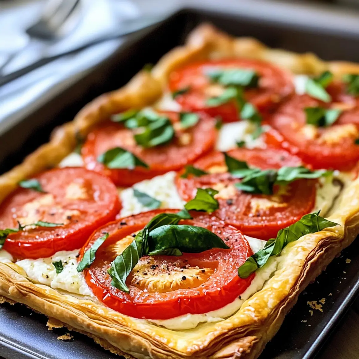 Verteile den cremigen Boursin-Käse gleichmäßig über die innere Fläche der Blätterteigbasis. Streue das gehackte frische Basilikum darauf und schichte die Tomatenscheiben leicht überlappend darüber, um eine ansprechende Optik zu erzielen.