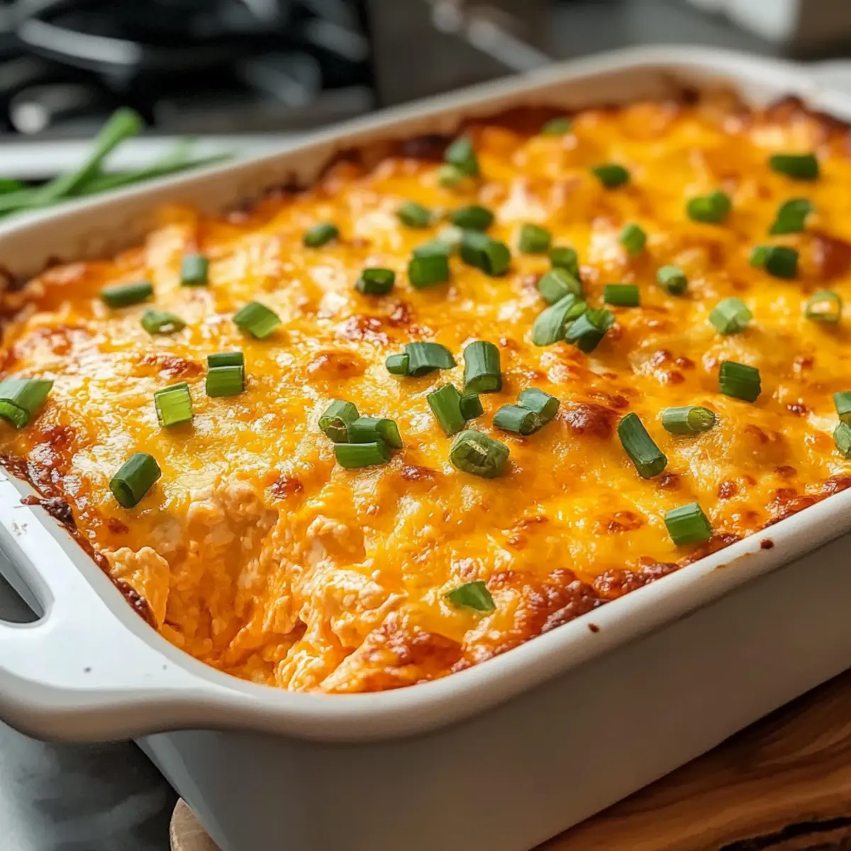 Nimm den Topf vom Herd und füge das zerkleinerte Hühnchen, die Hälfte des Mozzarella und die Hälfte des Cheddars sowie die Frühlingszwiebeln hinzu. Mische alles gut durch, bis die Zutaten gleichmäßig verteilt sind und der Überbackene Buffalo-Hühnchen-Dip schön cremig wirkt.